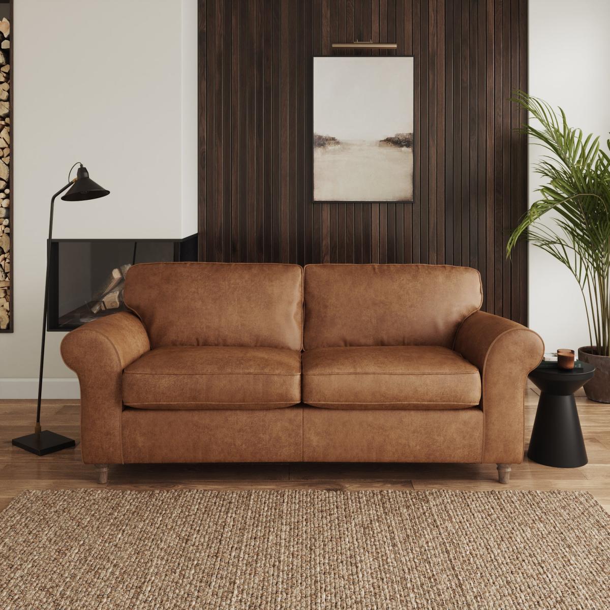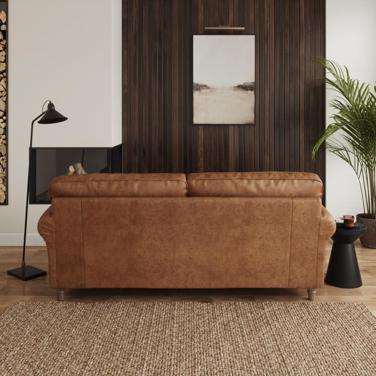 * Classic Shape* Curved arms* Foam and Fibre filled* Turned wooden feet With gracefully scrolled arms and elegantly turned wooden feet, this sofa presents a timeless style that effortlessly elevates any room. The durable faux leather upholstery is accented with piped edge detailing for a sophisticated touch. Enhanced with brand-new foam seat and back cushions, it promises luxurious comfort alongside its exquisite design. This product has fibre filled seat cushions. This means they require vigorous plumped by shaking and redistributing the fibres daily. This will add air back into the fibres and preventing clumping, flattening and the seat dipping.