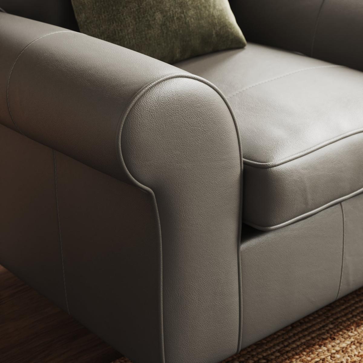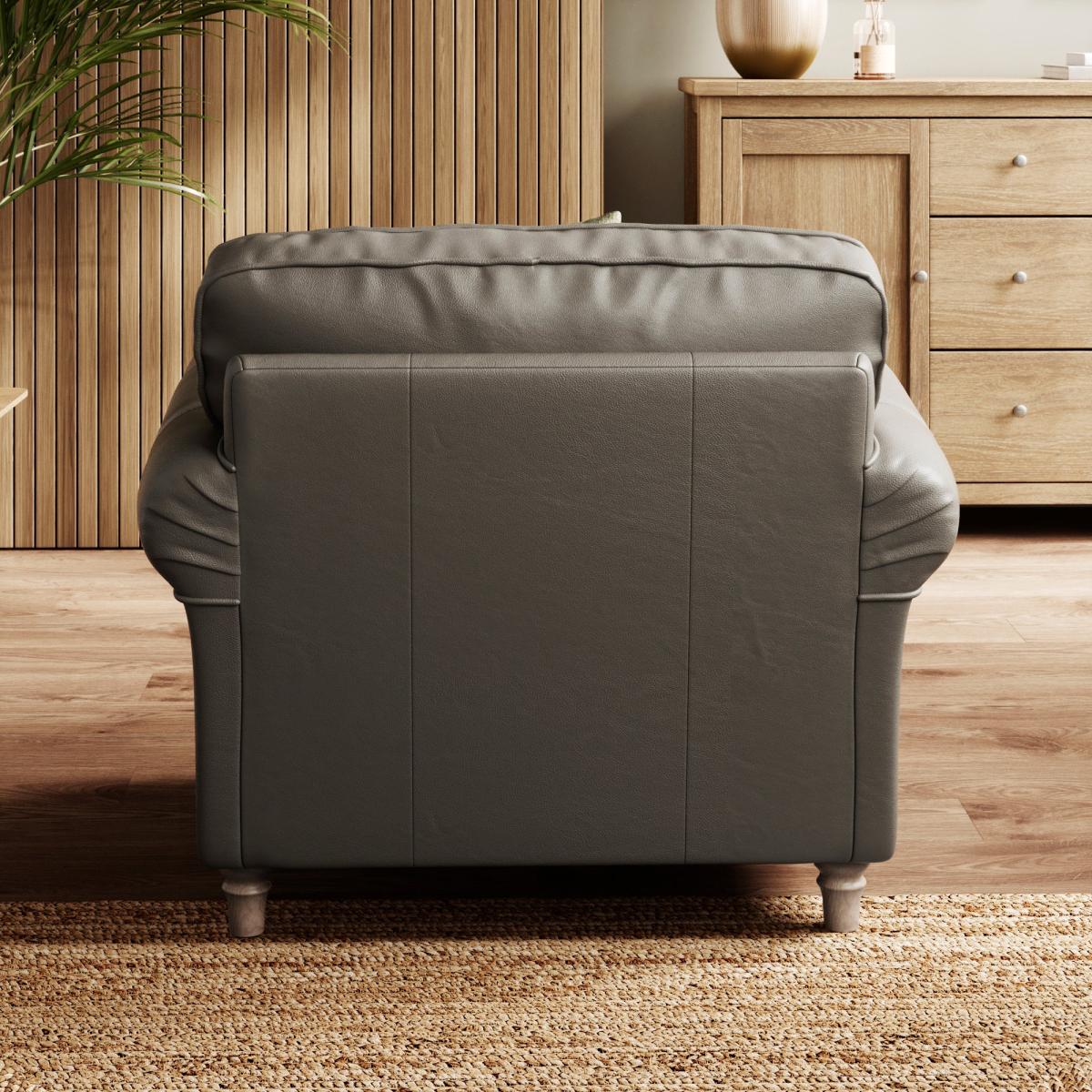 I’m a fan of this Flori chair for its generous rolled arms and firm leather upholstery - it brings a smart but inviting feel to settings from classic country cottages to pared-back modern schemes. The muted grey tone works beautifully against warm oak or walnut furniture, while a textured wool throw or velvet cushion adds contrast without overwhelming. Position beside a slimline side table and floor lamp for a reading nook, or anchor it on a jute rug to balance more formal elements.