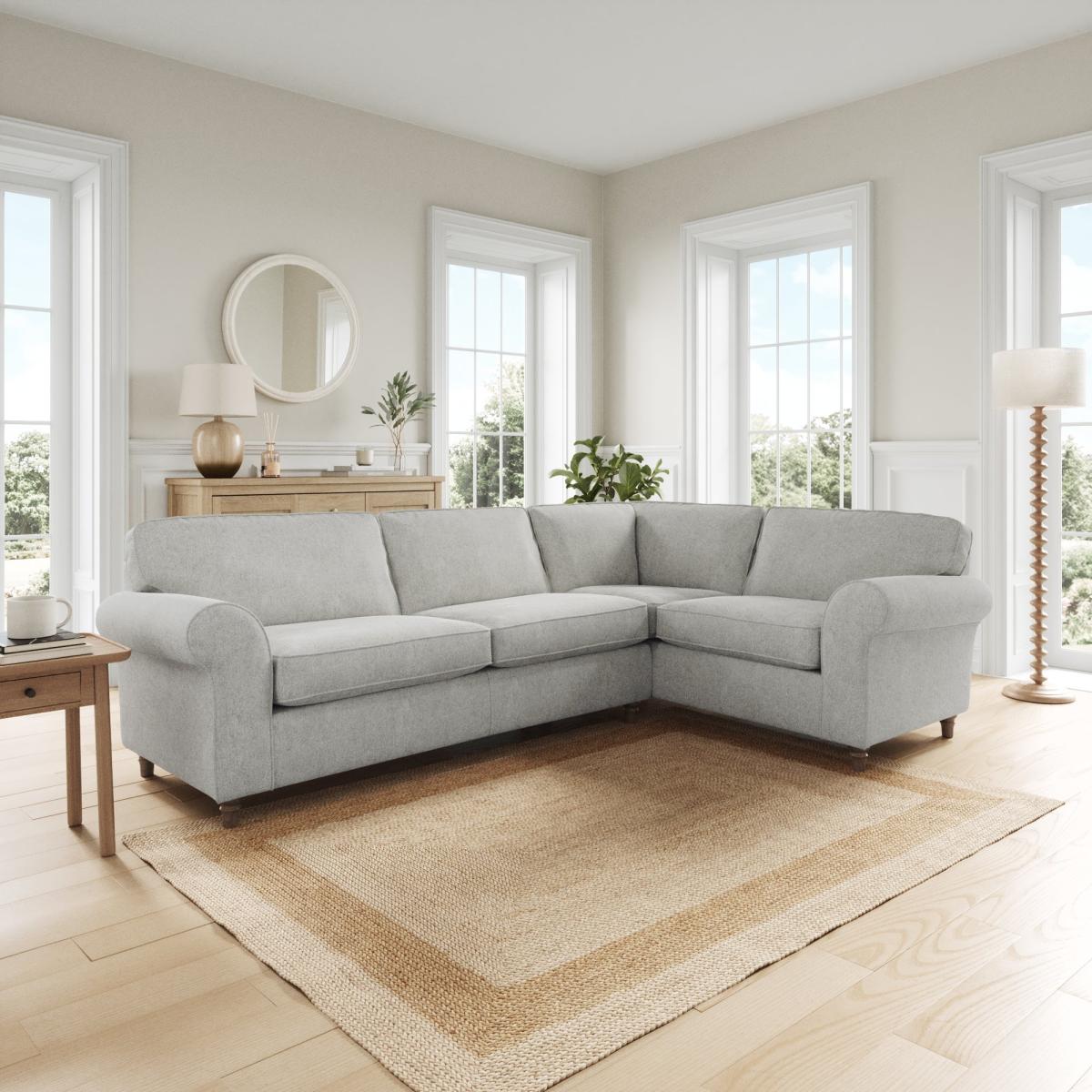 * Classic Shape* Curved arms* Foam and Fibre filled* Turned wooden feet Crafted with gracefully scrolled arms and elegantly turned wooden feet, the Flori sofa range presents a timeless style that effortlessly elevates any room. Available in a selection of colour palettes, this corner sofa sofa boasts upholstery in soft chenille, accented with piped edge detailing for a sophisticated touch. Enhanced with brand-new foam seat and back cushions, it promises luxurious comfort alongside its exquisite design. This product has fibre filled seat cushions. This means they require vigorous plumped by shaking and redistributing the fibres daily. This will add air back into the fibres and preventing clumping, flattening and the seat dipping.