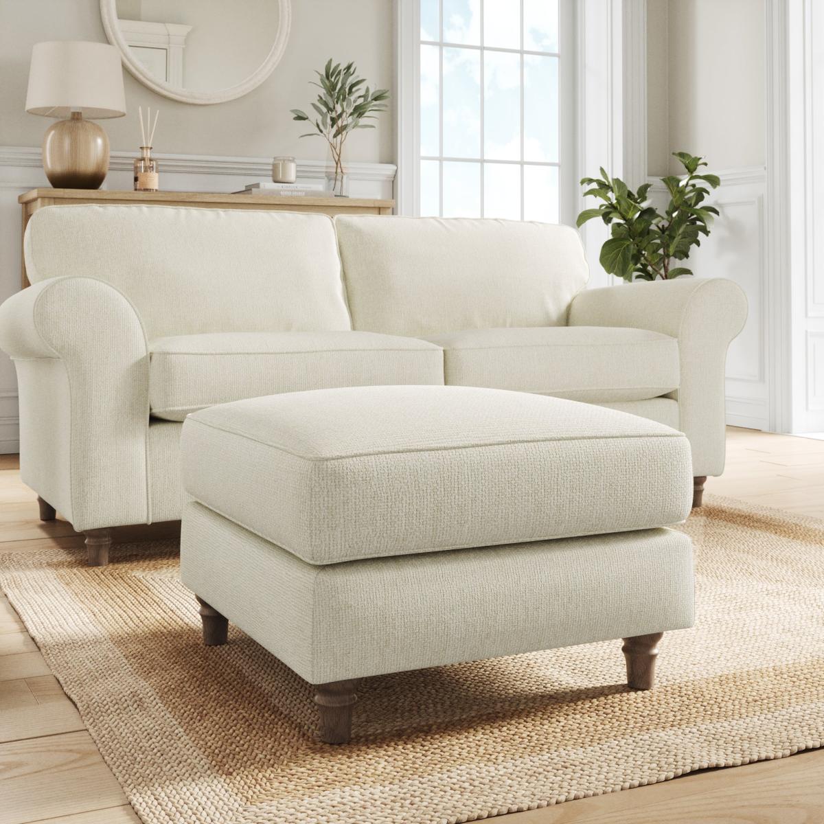 * Classic Shape* Foam and Fibre filled* Turned wooden feet With its sturdy wooden feet and understated elegance, this footstool adds a touch of timeless sophistication to any living space. Available in a variety of rich tones, the chunky chenille upholstery is complemented by tasteful piping detail, enhancing its refined appearance. Enhanced with newly filled foam cushioning, it ensures exceptional comfort and durability. This product has fibre filled seat cushions. This means they require vigorous plumped by shaking and redistributing the fibres daily. This will add air back into the fibres and preventing clumping, flattening and the seat dipping.