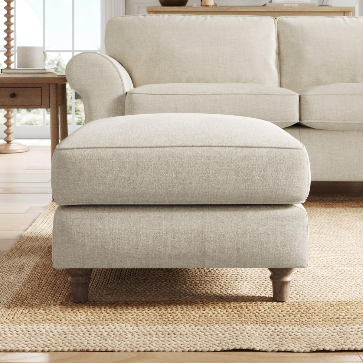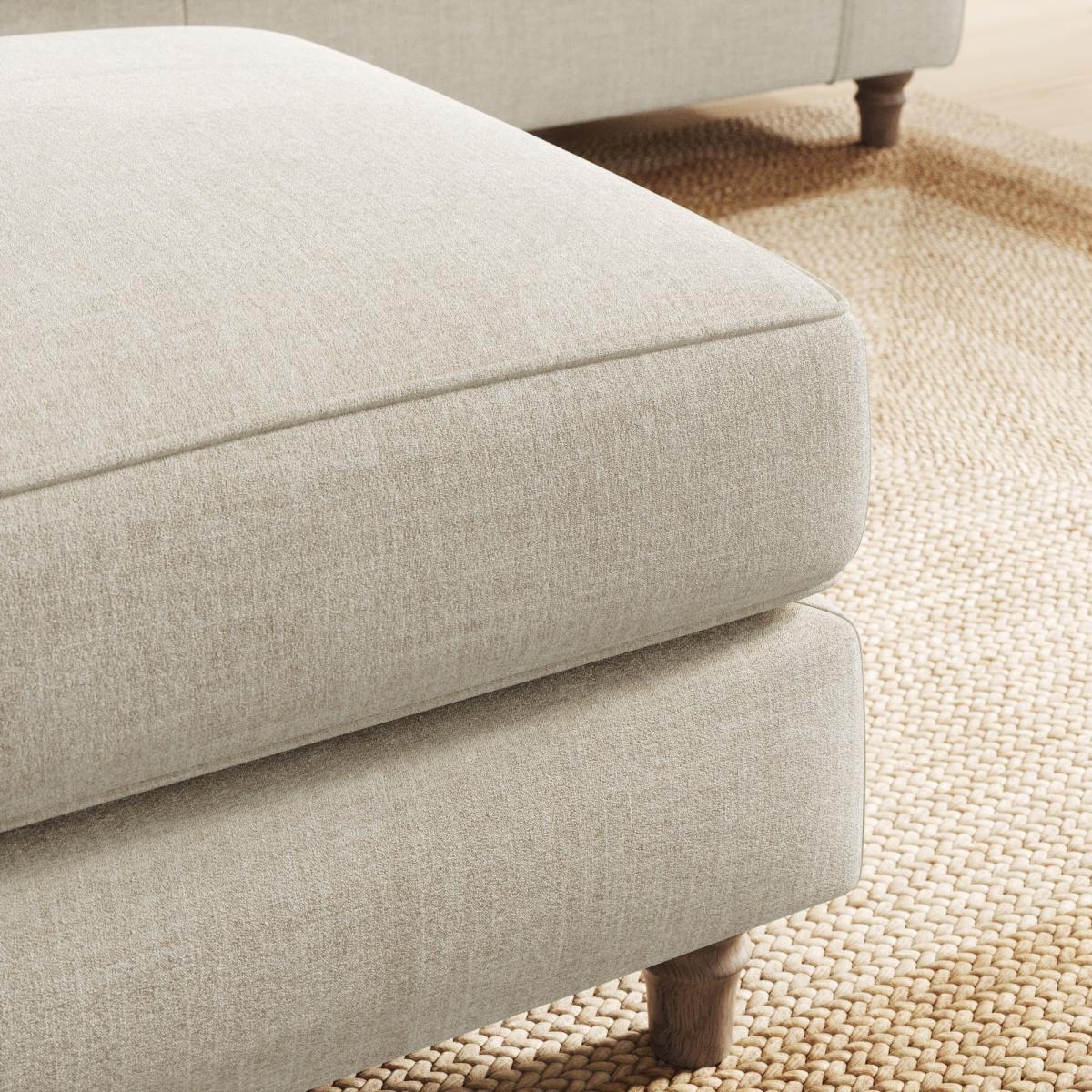 I’m a fan of the Flori footstool because its soft chenille weave in a warm neutral tone adds texture without overwhelming a space. Its clean lines and modest timber feet make it equally suited to Scandi-inspired living rooms, relaxed coastal schemes or understated contemporary interiors. For practical styling, use it as a low coffee table alternative - pop a slim wooden tray on top for drinks and books - or position it in front of an armchair to create a cosy reading nook. Layer it onto a natural-fibre rug alongside contrasting cushions or a lightweight throw to introduce subtle depth and keep everything feeling inviting.