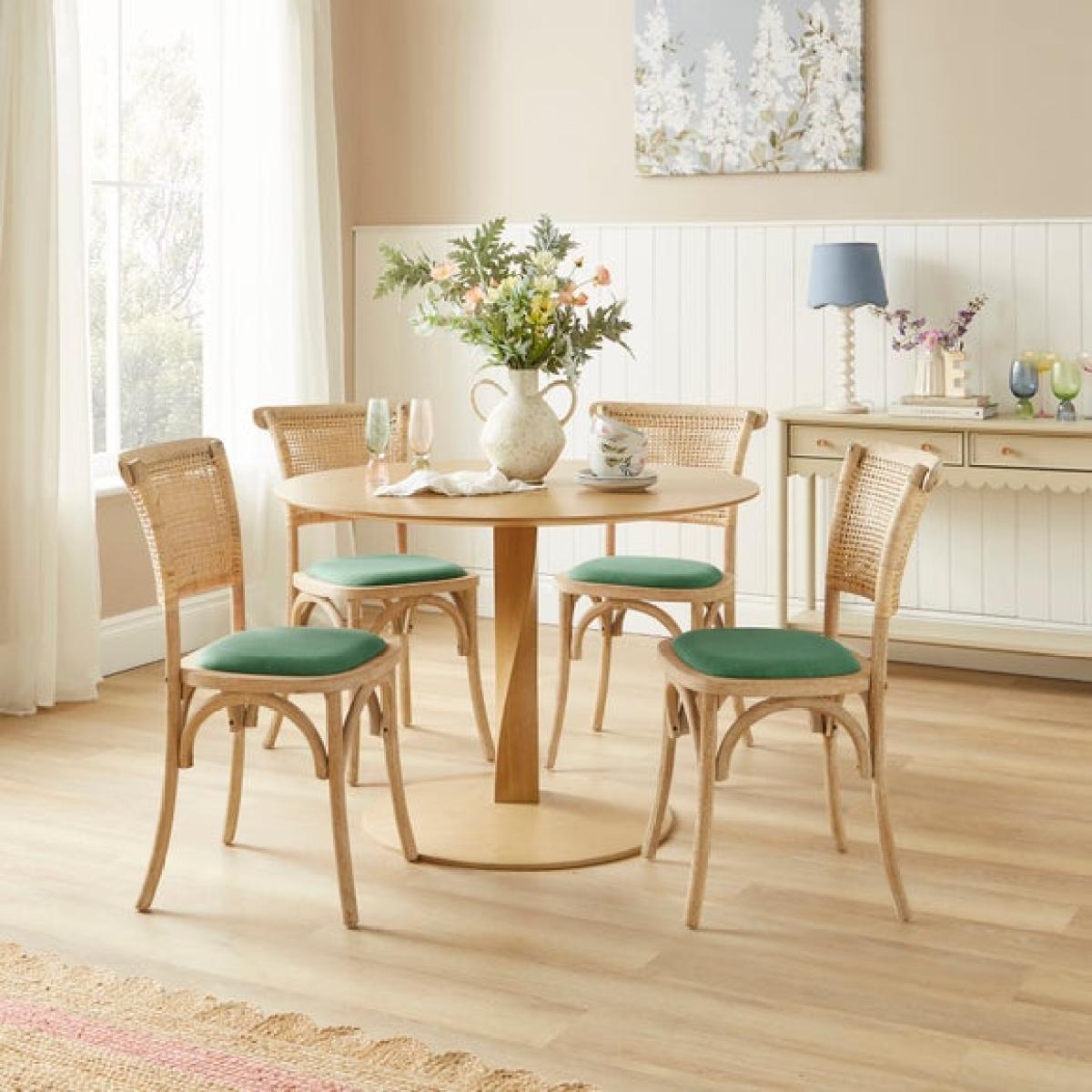 I love this florine dining chair because of its versatile natural wood finish and the pop of colour from the fabric seat, which makes it easy to incorporate into a range of interiors. It works particularly well in Scandi-inspired or cottage-style dining rooms, where its simple, elegant lines and rattan detail add a touch of warmth and texture. For practical styling, consider pairing it with a wooden or neutral-toned table to keep the look cohesive, and add a cushion or throw on the seat for extra comfort and colour. It’s a great choice for creating an inviting, relaxed dining space with a classic yet contemporary feel.