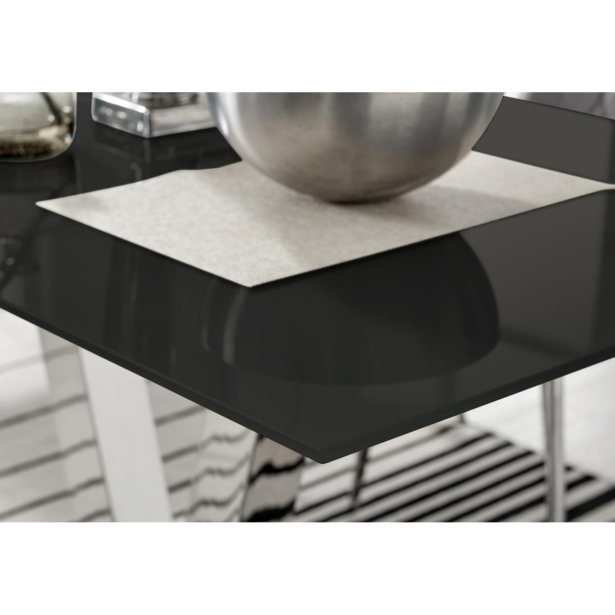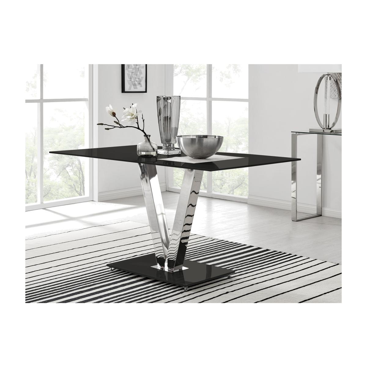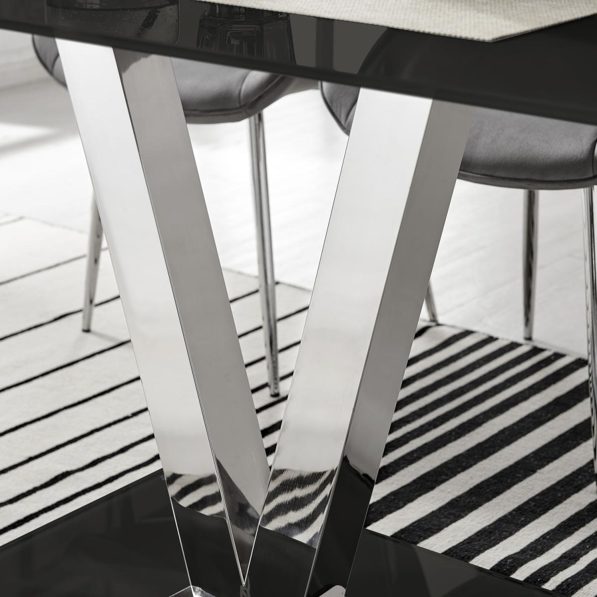 The sophisticated Florini table combines a modern chrome look with polished black glass. Acting not only as a sturdy support the chrome finished metal "V" legs also add an elegant and unique touch. Boasting a large 140cm x 80cm table top made from strong tempered glass, the table offers plenty of room for dining with guests. The Florini also has easy clean and wipe surfaces allowing it to look brand new for years to come!