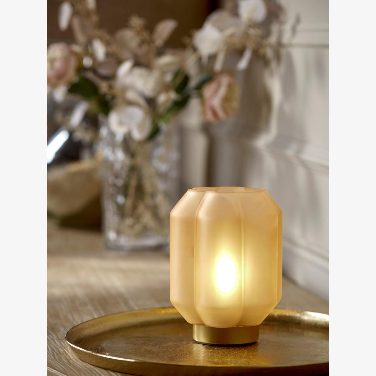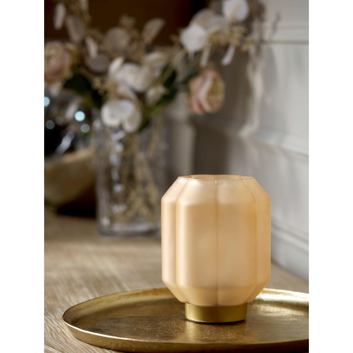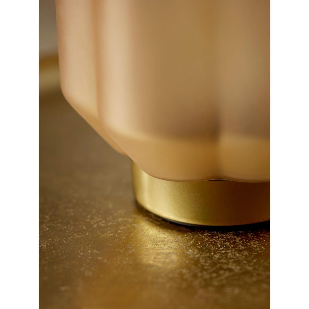 In a soft peach tone, this table lamp radiates elegance and sophistication. Scalloped edges create delicate lines, whilst the gold base adds a luxurious finish for a gentle glow in your home. Even better, it is battery powered so doesnt require a mains socket; place anywhere in your home that needs uplifting and elevating with a touch of warmth.  Discover how to create the perfect lighting scheme for your home using our Lighting Buying Guide.