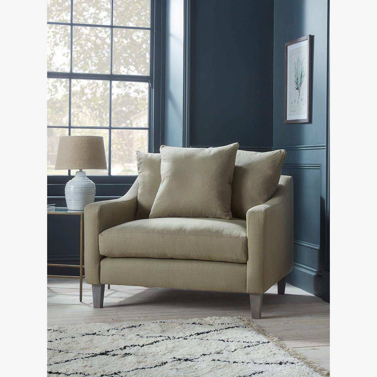 The handcrafted wooden frame of our Floro loveseat features slim sloping arms, a shallow back piled high with three scatter cushions and a seat cushion well filled with foam and natural feathers for superior support and minimal plumping. The seat stands on simple carved feet, with a polished limewashed oak finish. The Floro range also includes a two seater and three seater sofa and an ottoman. Pictured here in our Fern Herringbone material, our Floro collection can be upholstered in a choice of 34 distinctive shades and six fabrics to suit your style. Read our Upholstery FAQs View our full Upholstery Terms and Conditions