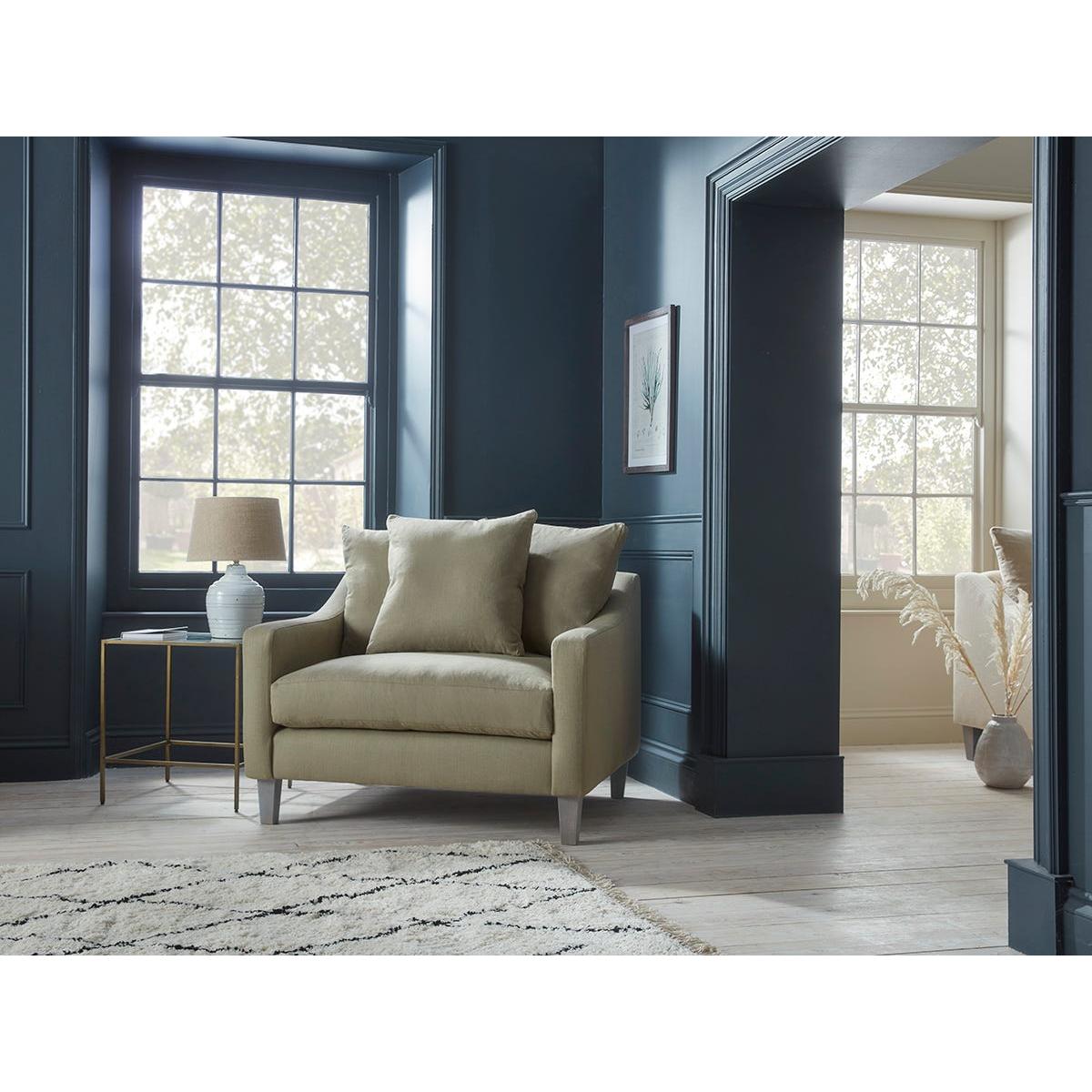 The handcrafted wooden frame of our Floro loveseat features slim sloping arms, a shallow back piled high with three scatter cushions and a seat cushion well filled with foam and natural feathers for superior support and minimal plumping. The seat stands on simple carved feet, with a polished limewashed oak finish. The Floro range also includes a two seater and three seater sofa and an ottoman. Pictured here in our Fern Herringbone material, our Floro collection can be upholstered in a choice of 34 distinctive shades and six fabrics to suit your style. Read our Upholstery FAQs View our full Upholstery Terms and Conditions