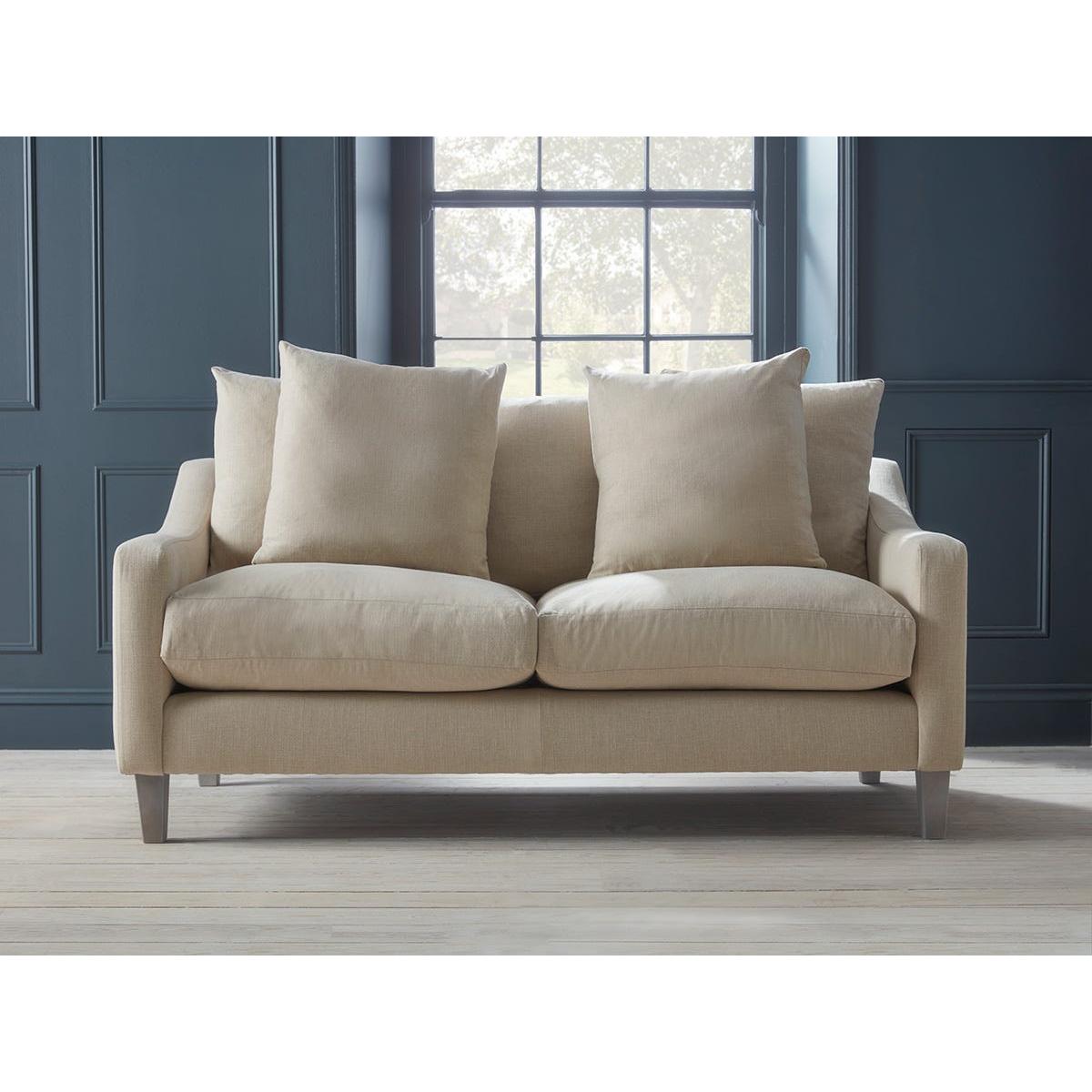 The handcrafted wooden frame of our Floro sofa features slim sloping arms, a shallow back piled high with individual scatter cushions and two seat cushions well filled with foam and natural feathers for superior support and minimal plumping. The sofa stands on simple carved feet, with a polished limewashed oak finish. The Floro range also includes a loveseat and an ottoman. Pictured here in our Sand Herringbone material, our Floro collection can be upholstered in a choice of 34 distinctive shades and six fabrics to suit your style. Read our Upholstery FAQs View our full Upholstery Terms and Conditions