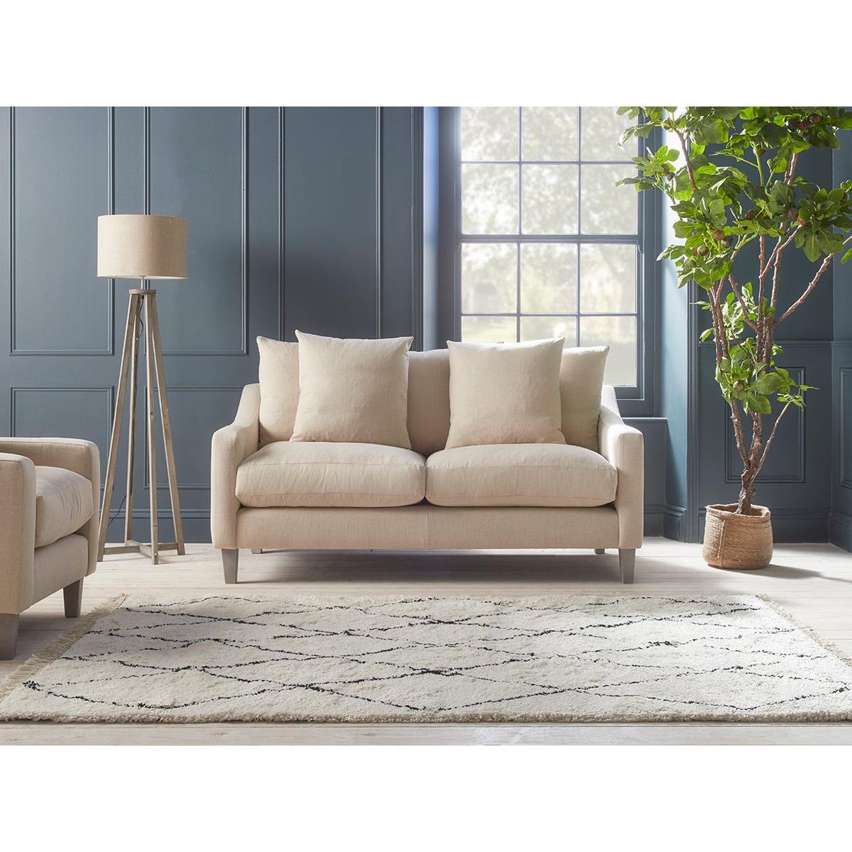 The handcrafted wooden frame of our Floro sofa features slim sloping arms, a shallow back piled high with individual scatter cushions and two seat cushions well filled with foam and natural feathers for superior support and minimal plumping. The sofa stands on simple carved feet, with a polished limewashed oak finish. The Floro range also includes a loveseat and an ottoman. Pictured here in our Sand Herringbone material, our Floro collection can be upholstered in a choice of 34 distinctive shades and six fabrics to suit your style. Read our Upholstery FAQs View our full Upholstery Terms and Conditions