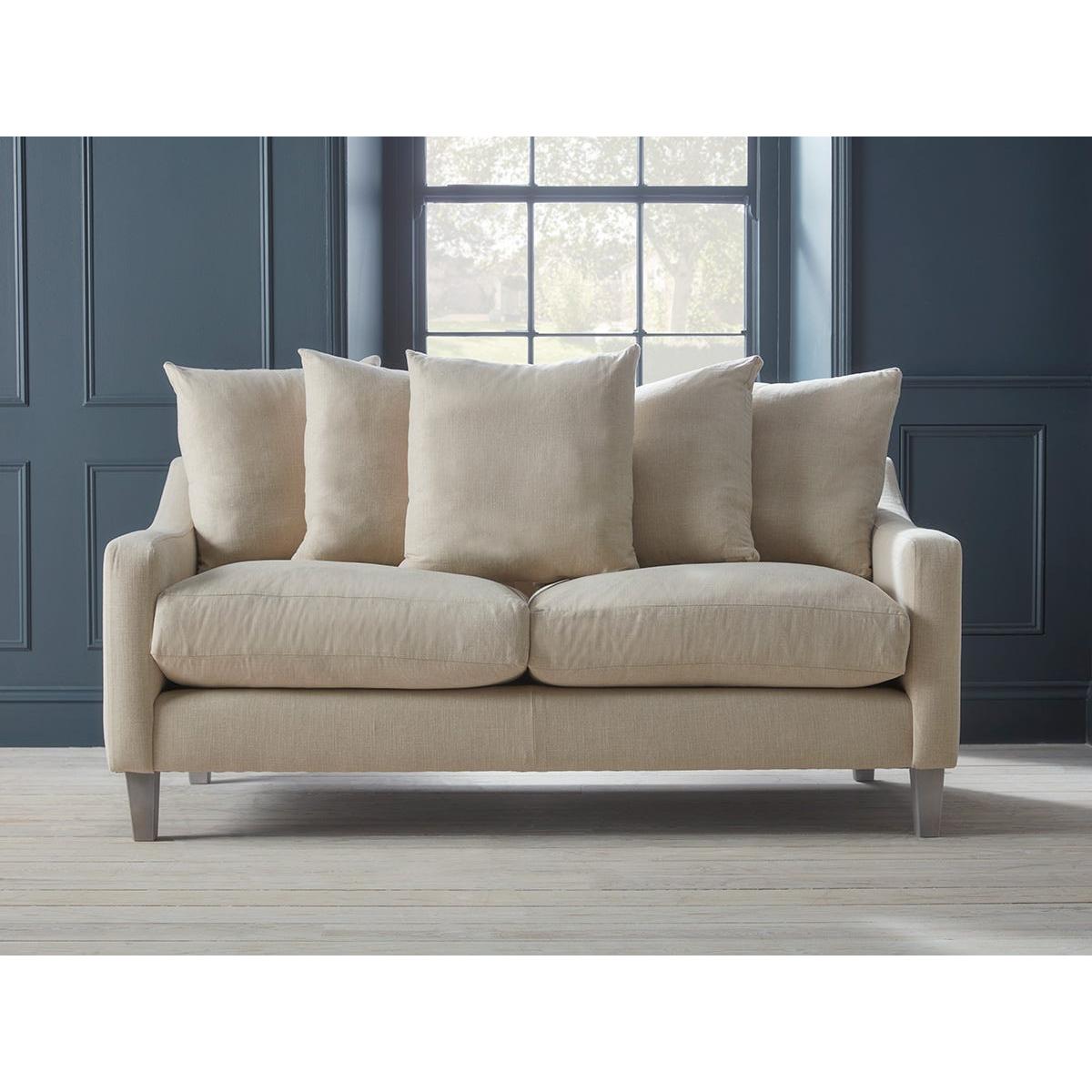 The handcrafted wooden frame of our Floro sofa features slim sloping arms, a shallow back piled high with individual scatter cushions and two seat cushions well filled with foam and natural feathers for superior support and minimal plumping. The sofa stands on simple carved feet, with a polished limewashed oak finish. The Floro range also includes a loveseat and an ottoman. Pictured here in our Sand Herringbone material, our Floro collection can be upholstered in a choice of 34 distinctive shades and six fabrics to suit your style. Read our Upholstery FAQs View our full Upholstery Terms and Conditions