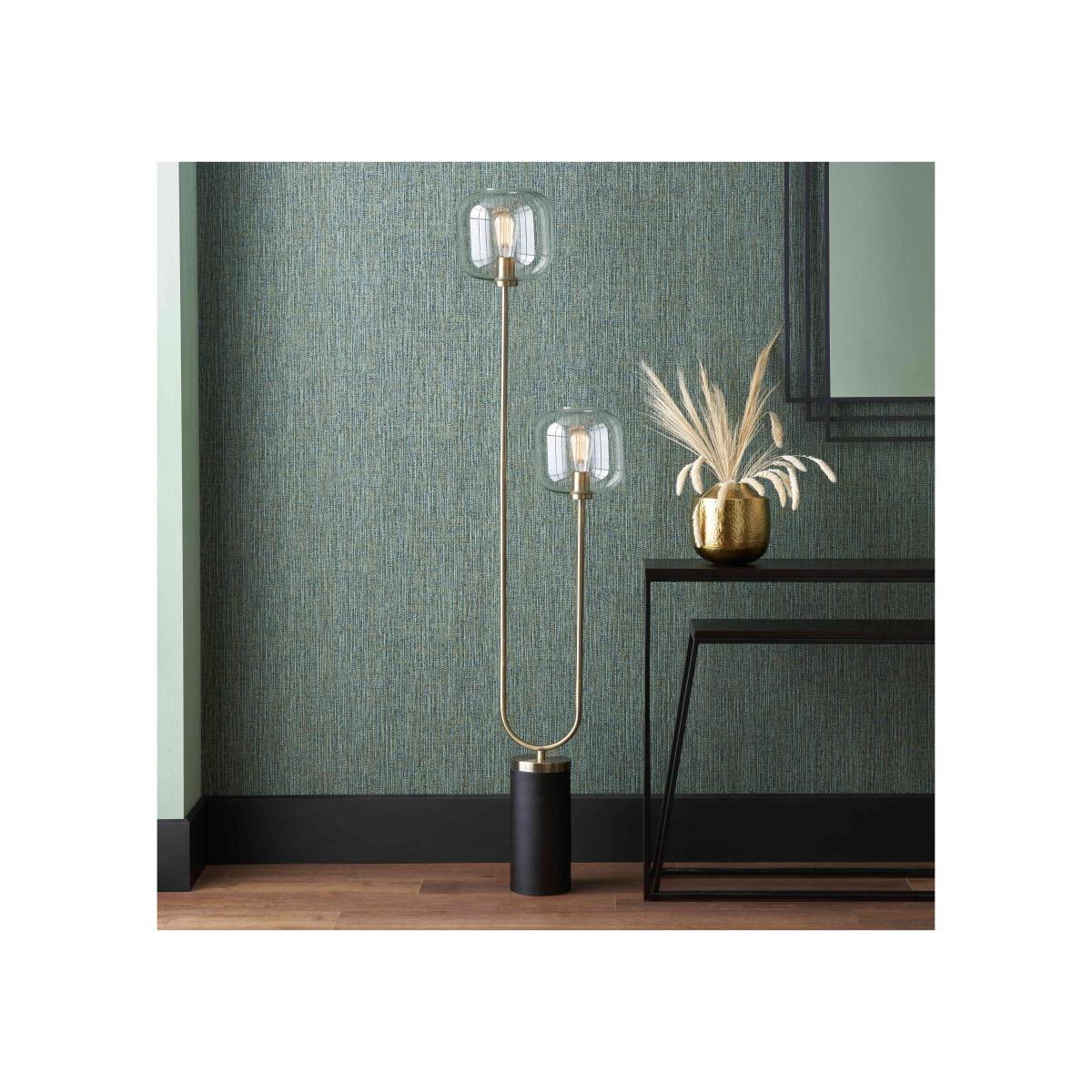 Contemporary elegance with a touch of industrial style comes to the fore in our Flory floor lamp. A solid metal base supports a two-prong bulb holder. Why you'll love it Elegant industrial style. Asymmetric two-light design suits contemporary homes. Black and gold-finished metal base. Clear glass lampshades. This floor lamp is part of the Furniture Village lighting collection. What you need to know Metal base. Supplied with 250 cm cable. Inline foot switch. Requires 2 x E27 GLS 10-12 W bulb (not included). Dust with a soft, clean cloth. Unplug while cleaning. Dimensions Height: 172 cm (67 in). Depth: 20 cm (8 in). Width: 38 cm (15 in).
