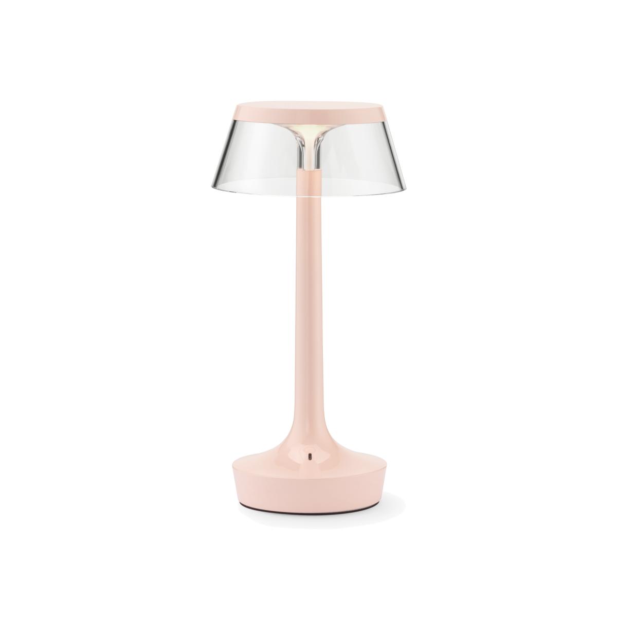 Bon Jour Unplugged table lamp by Philippe Starck for Flos is a compact, rechargeable version of Bon Jour T. It emits a diffuse light with a 4-step dimmer function under the base. Customize the lamp to your taste with shades in various colors and stands in copper, matt chrome, chrome, or white. Perfect for creating harmonious lighting in your home.