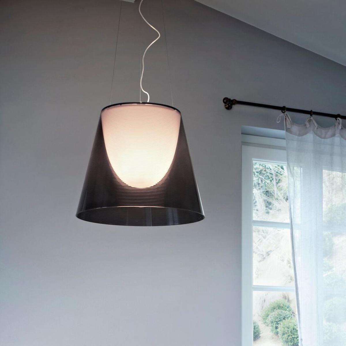 This stunning KTribe S3 is a contemporary ceiling lamp from Flos and designed by Philippe Starck; featuring a bronze diffuser manufactured in transparent polymethylmethacrylate with internal aluminized coating and asecond internal diffuser with opal white finish. There is three stainless steel support cables and white ceiling rose. This is the perfect ceiling lamp to add ambience and class to your home.