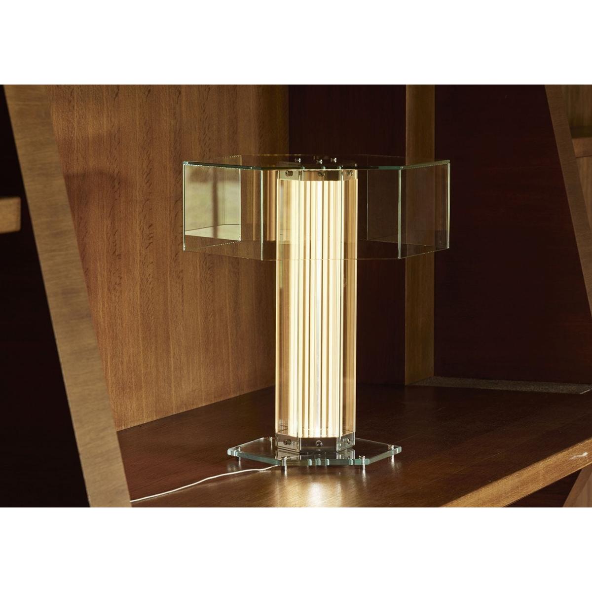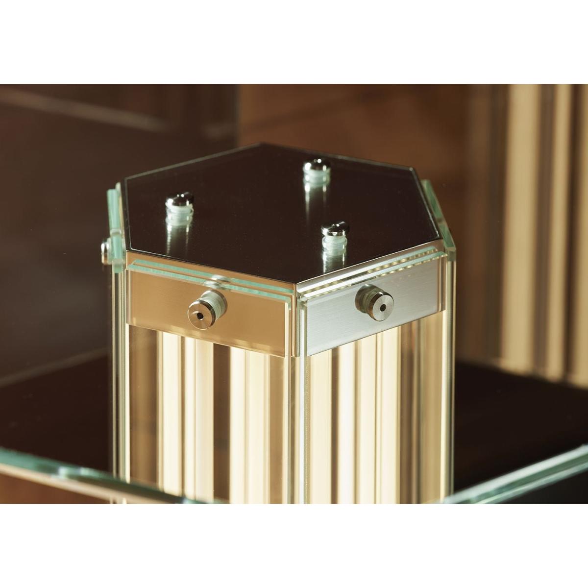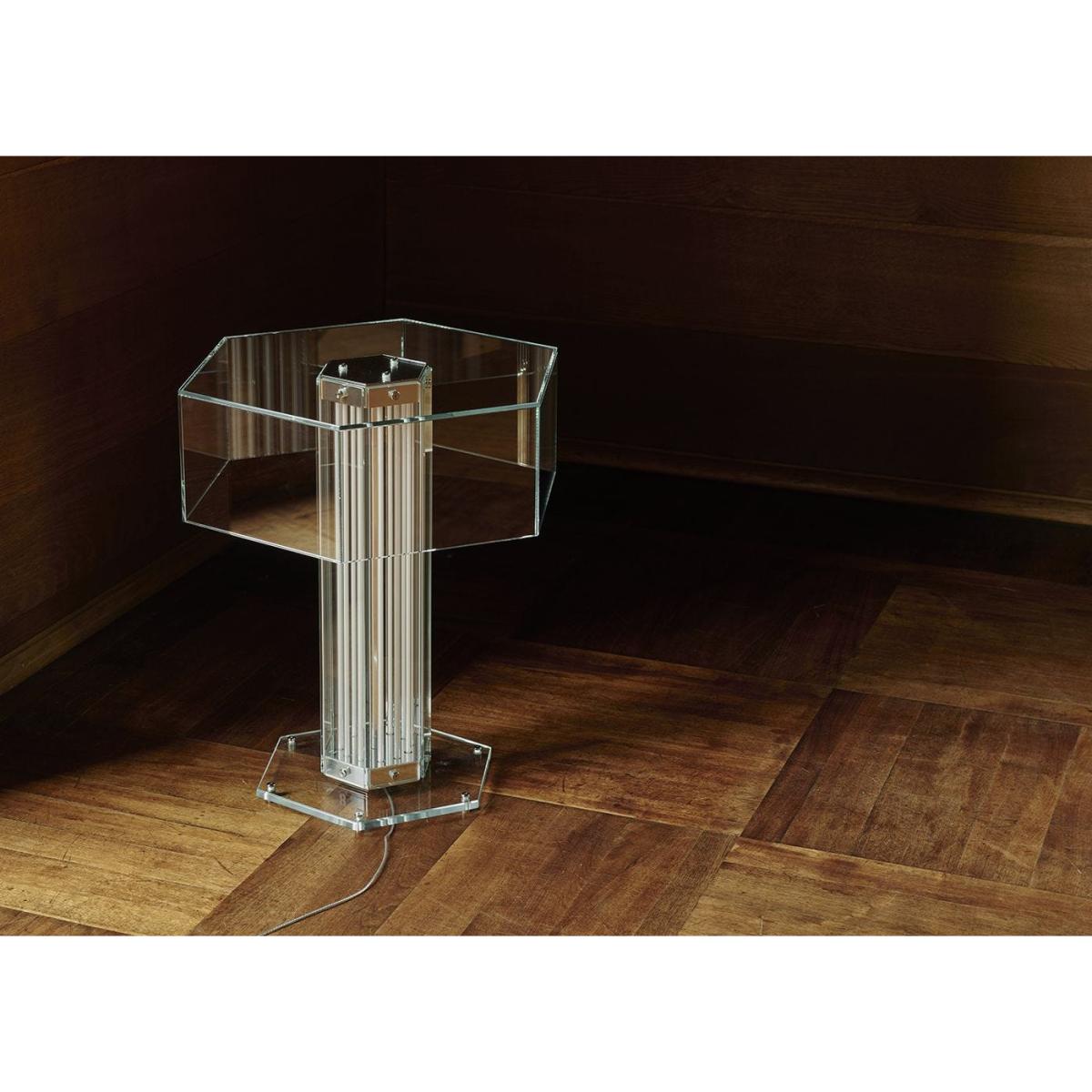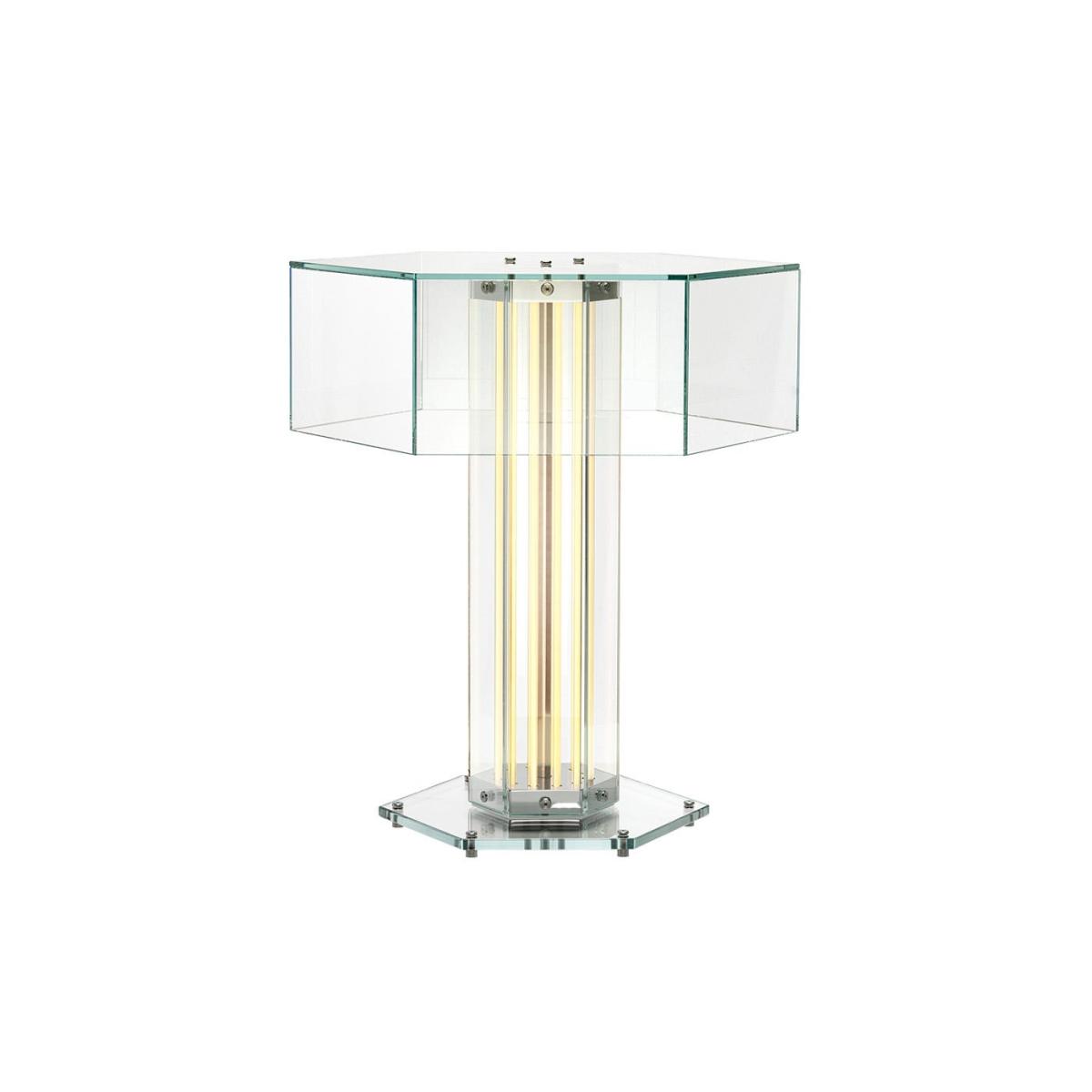 A paradigm of sculptural beauty, Super Wire is the first family of modular lamps designed by Formafantasma for Flos. Its design originated from the development of a custom-made light source: a thin, flat, soft, flexible LED strip which emits a warm and homogeneous light along its entire length. Housed within a hexagonal planar glass form and a polished aluminium frame, this table version consists of a single module surmounted by a hexagonal glass cover.