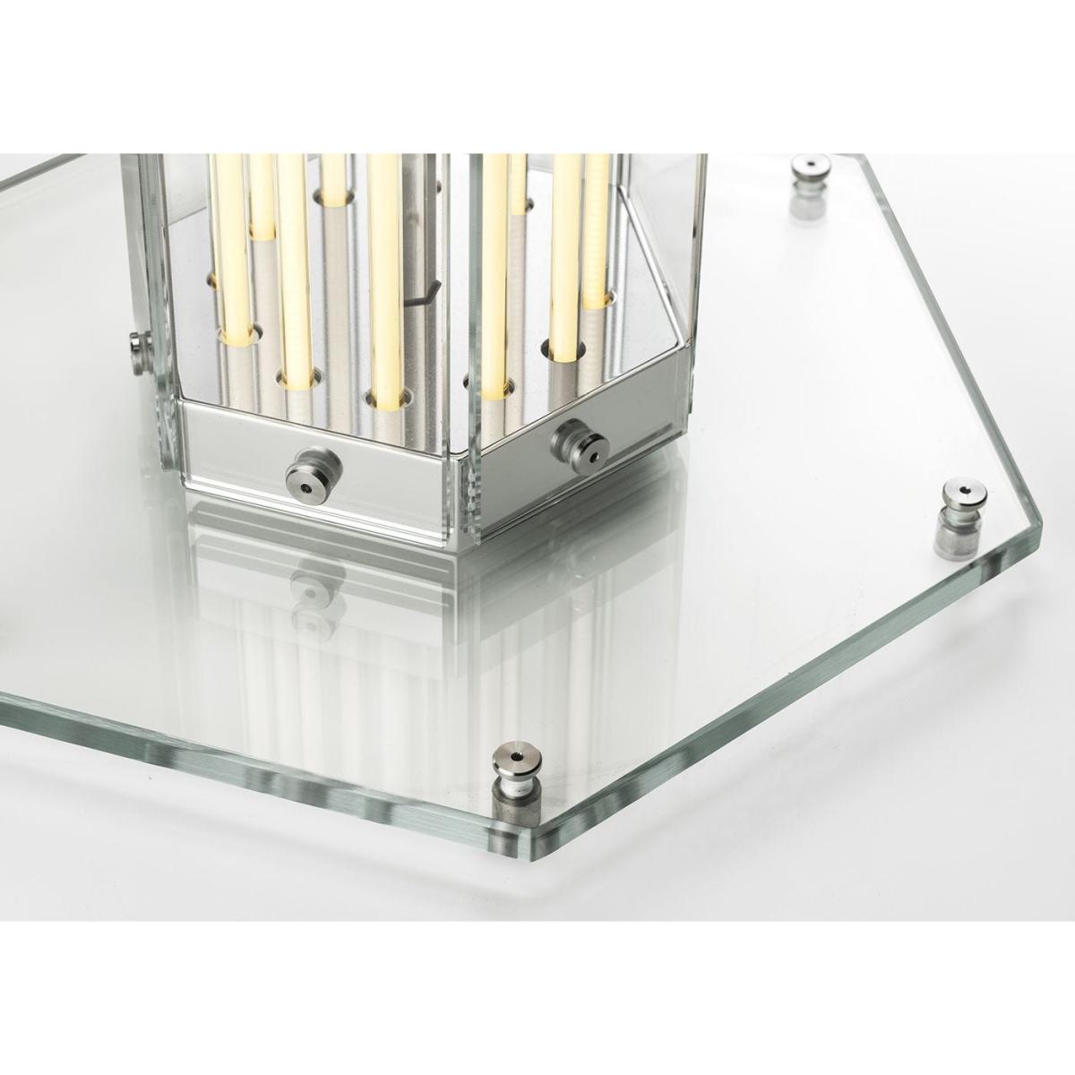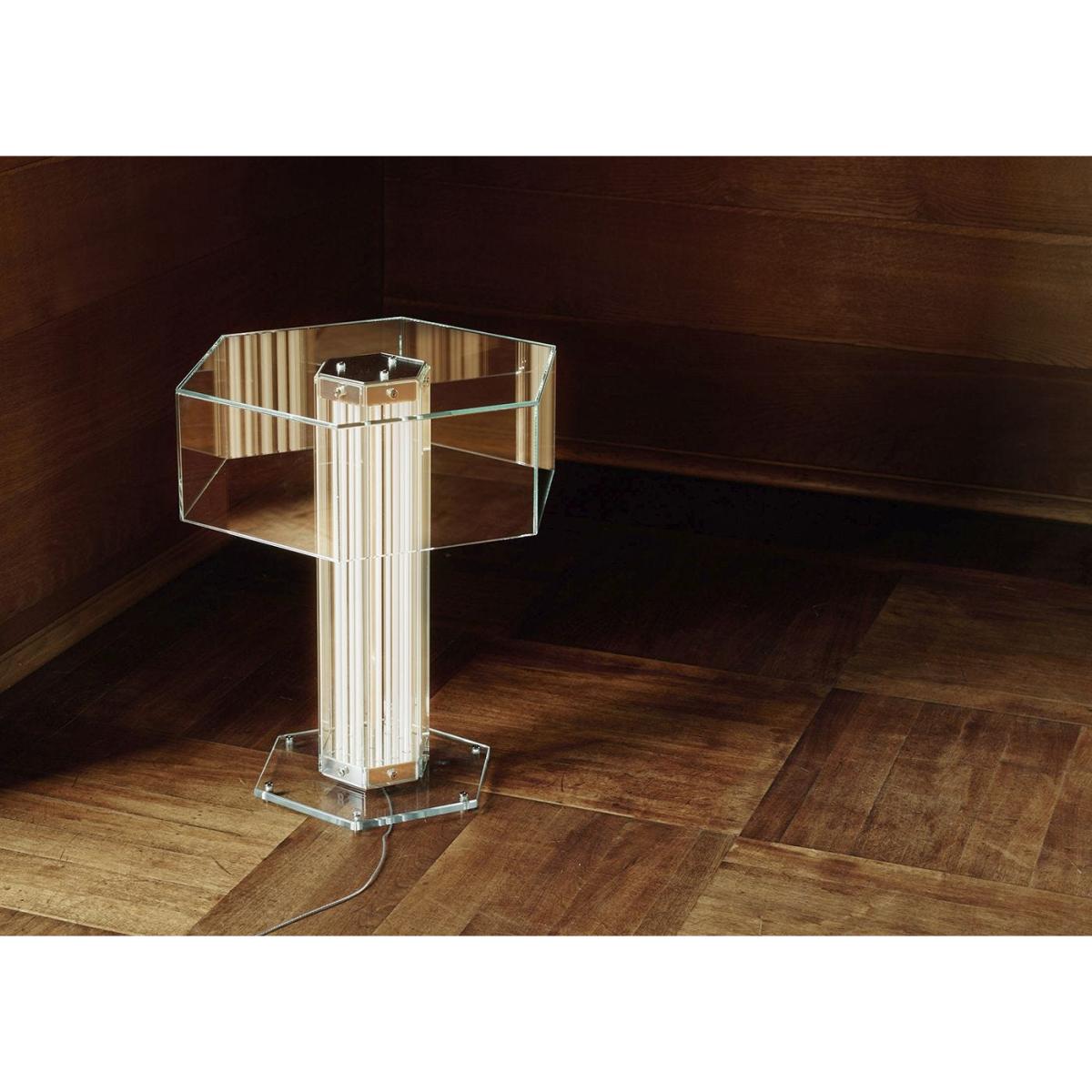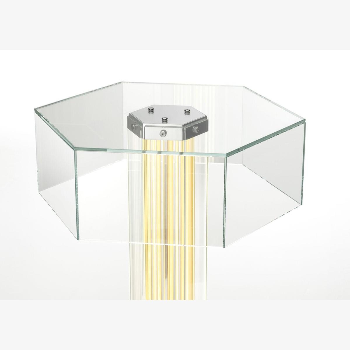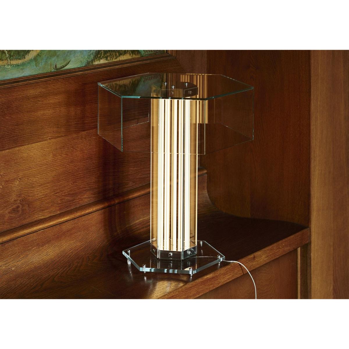 A paradigm of sculptural beauty, Super Wire is the first family of modular lamps designed by Formafantasma for Flos. Its design originated from the development of a custom-made light source: a thin, flat, soft, flexible LED strip which emits a warm and homogeneous light along its entire length. Housed within a hexagonal planar glass form and a polished aluminium frame, this table version consists of a single module surmounted by a hexagonal glass cover.