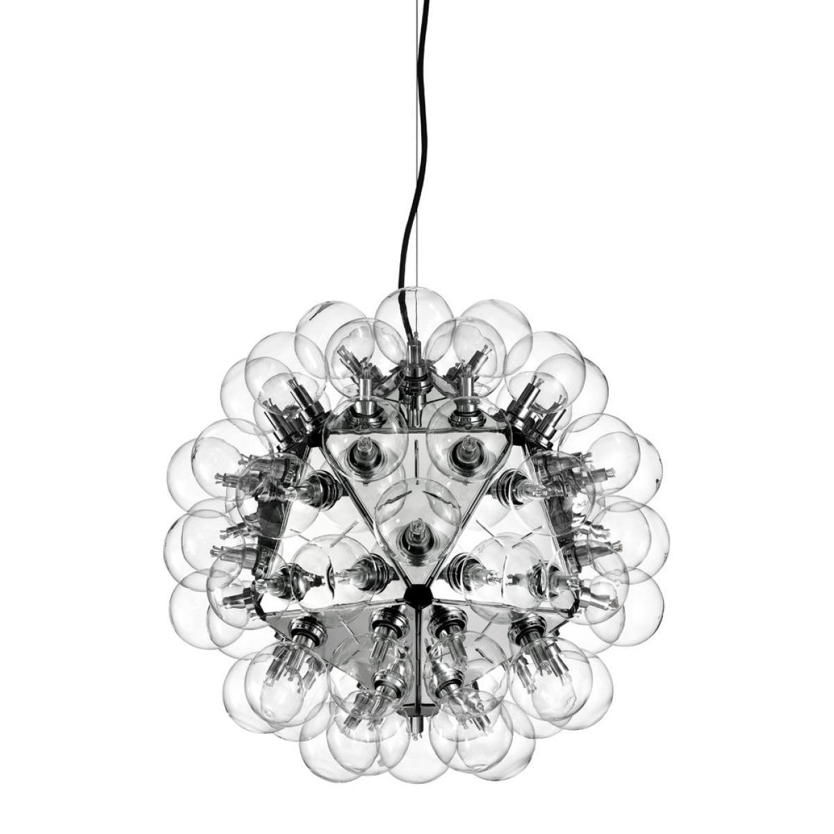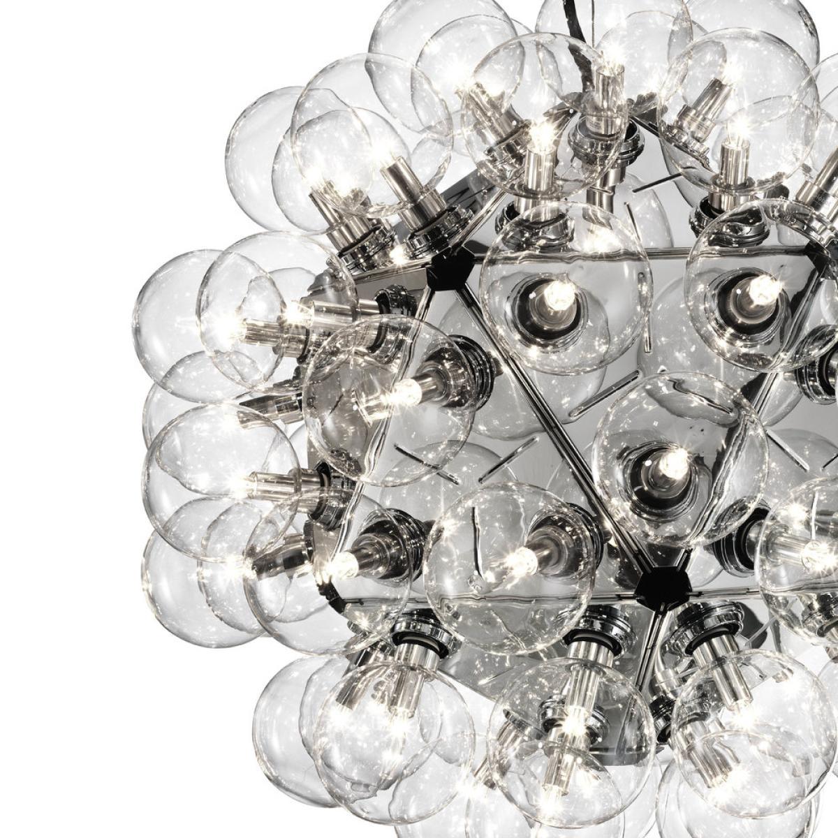 This beautifully designed Taraxacum 88 S1 ceiling fixture from Flos and designed by Achille Castiglioni provides direct and reflected lighting. The unique structure is formed by 20 pressed, polished aluminum triangles with 60 clear Globolux bulbs housed around the structure. Features a steel ceiling fitting and rose. A truly unique piece of lighting design.