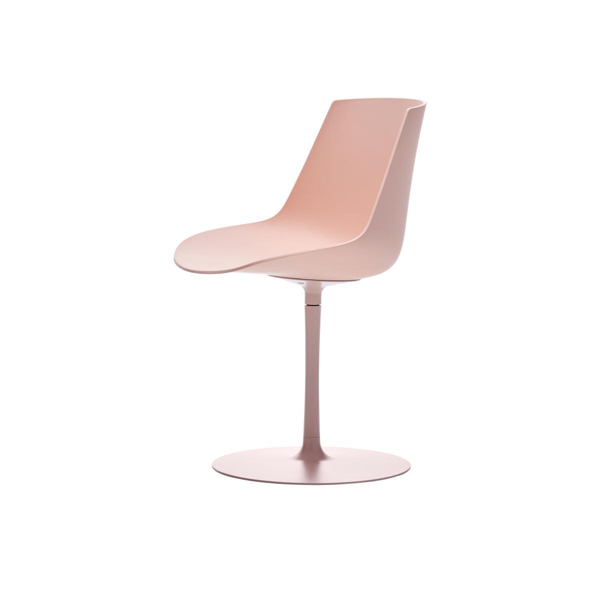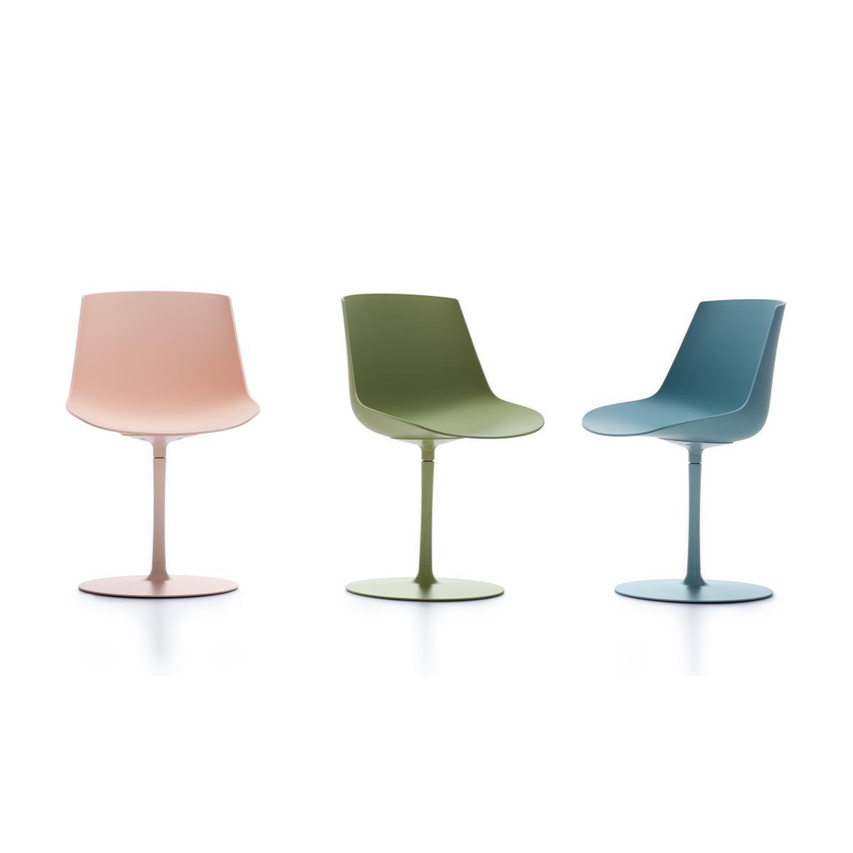 The French designer Jean-Maris Massaud, voted creator of the year at the Maison & Objet in 2009, signed MDF "Flow", a superb collection collection of chairs and armchairs: a simple style, carefully finished with rare elegance. The basic concept for this collection is to combine a comfortable polycarbonate shell with different legs to obtain a very wide range of uses: homes, offices, cafés, waiting rooms, etc. The Flow color range is a tribute to colour! It is available in different soft and powdered colours inspired by Japan. The large polycarbonate shell have contoured shapes that enable excellent comfort. Thanks to their soft touch coating, they have a matte finish. This Flow Color chair has a central 360° pivoting base. This base is the same colour as the shell.