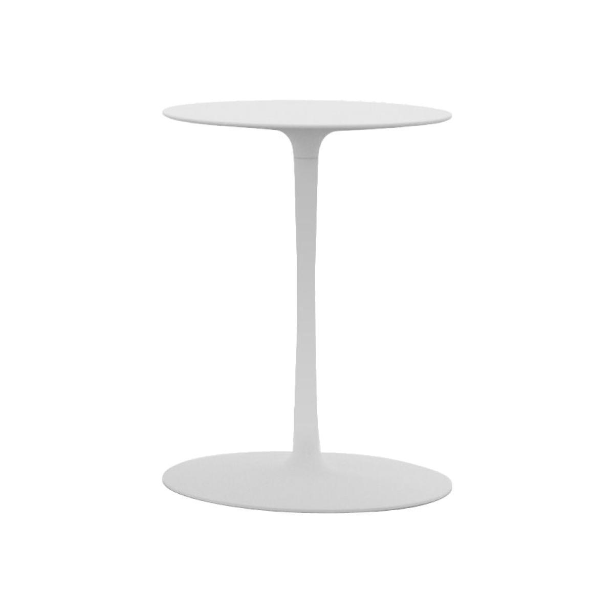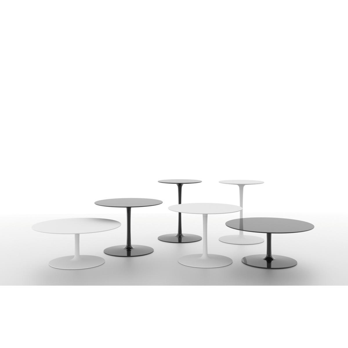 Round coffee tables in three dims. Base with central leg made of aluminium, lacquered in matt white or gloss black. Tabletops in matt white cristalplant®, or gloss black ceramilux®.
