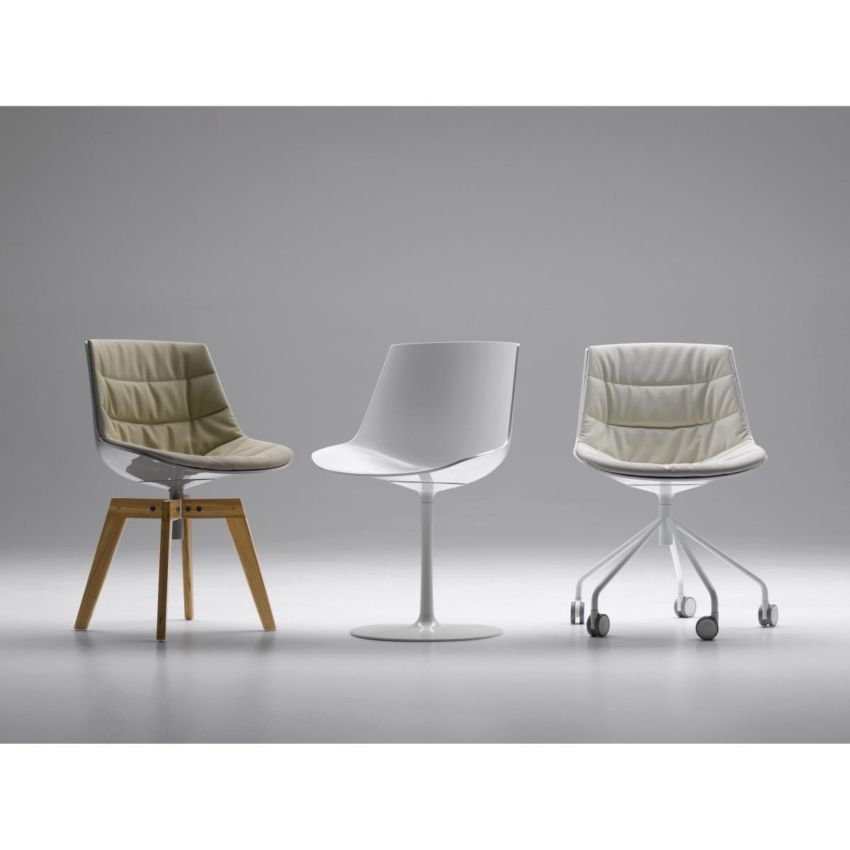 A family of seatings of great impact and comfort. Designed for the home, the office and the community areas. The shell, made from polycarbonate, is mass-pigmented in white, black, has a standard double finish: gloss outside, and goffered inside. Base options: 4-legged, sled, 5-legged, 5-point-star, with central leg, 4-legged in oak.