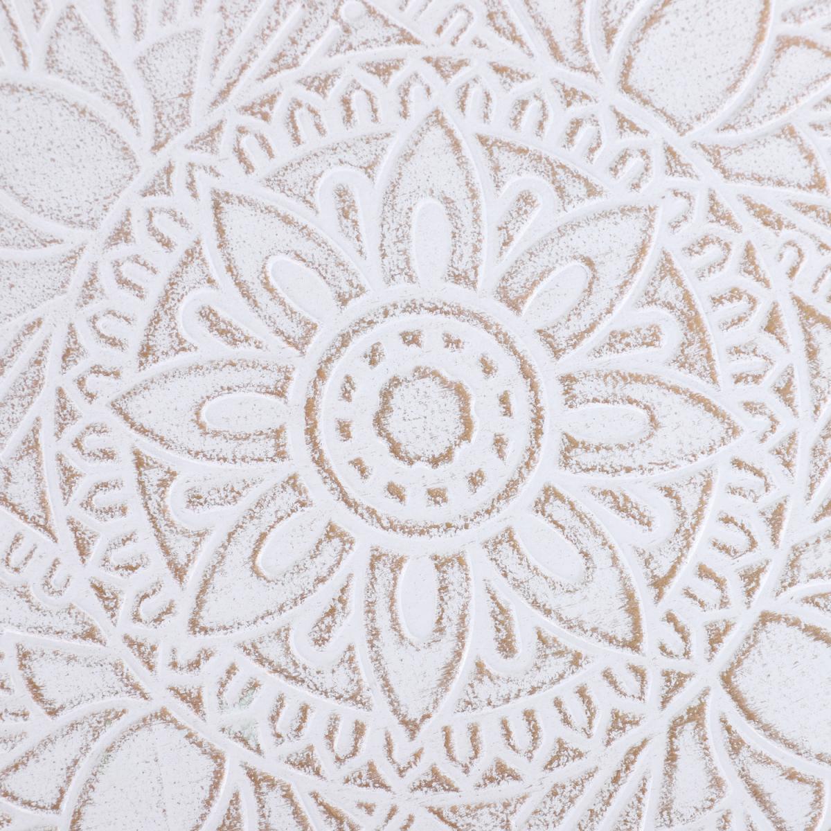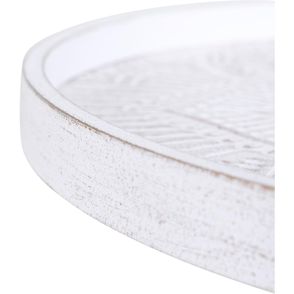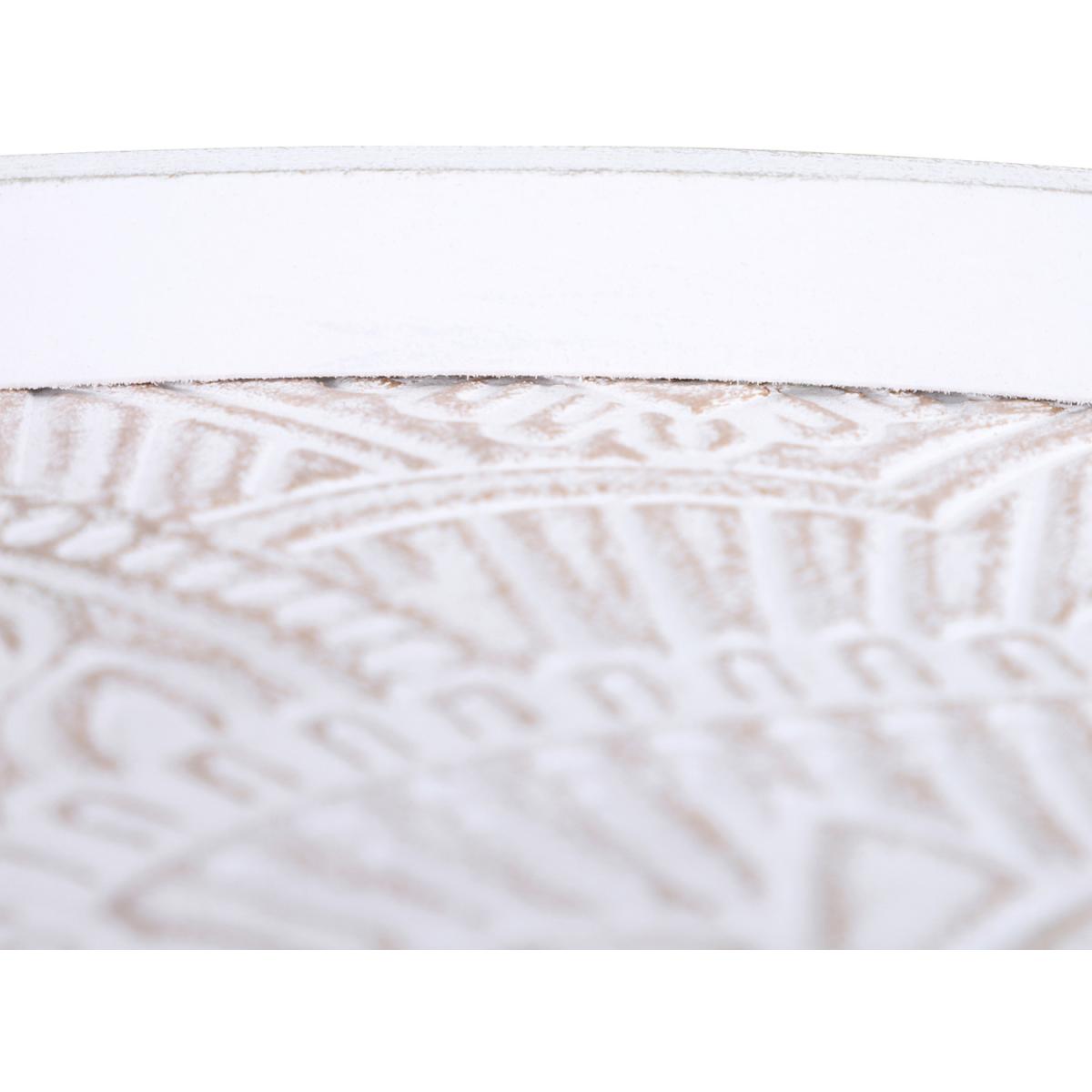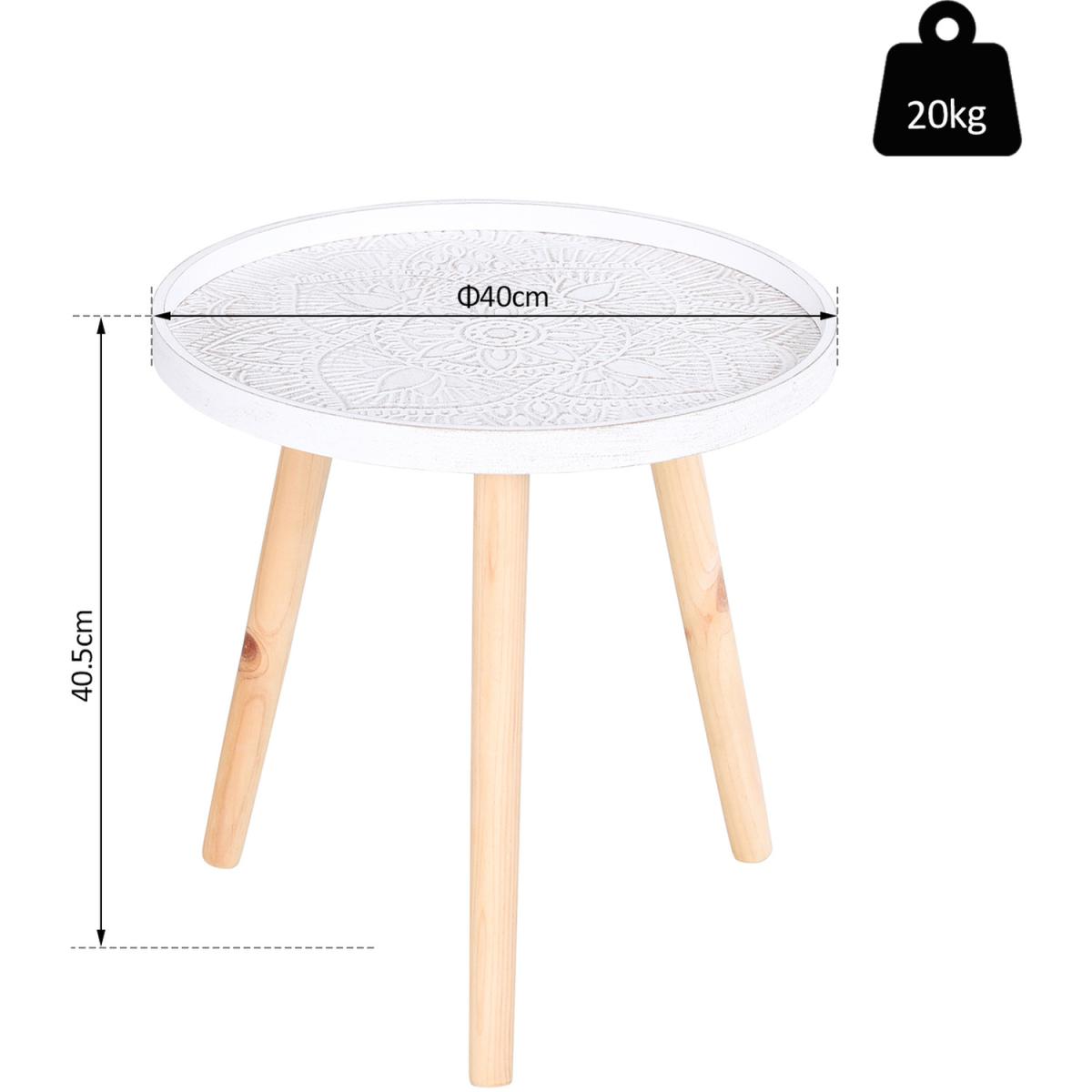 Bring beauty into your everyday surroundings with this side table from HOMCOM. Using MDF for enduring strength and resilience against everyday wear, the tabletop is crafted into a shallow saucer design, with raised edges to prevent anything from falling off and breaking. In a fresh white tone that brightens up your home instantly, the saucer is covered in flower etching all over for an elegant look, with water-resistant paint all over for extra protection. It is finished with three solid wooden legs, providing stability which is able to hold up to 20kg steadily. A beautiful companion for the bedroom, living room, hallway and office.