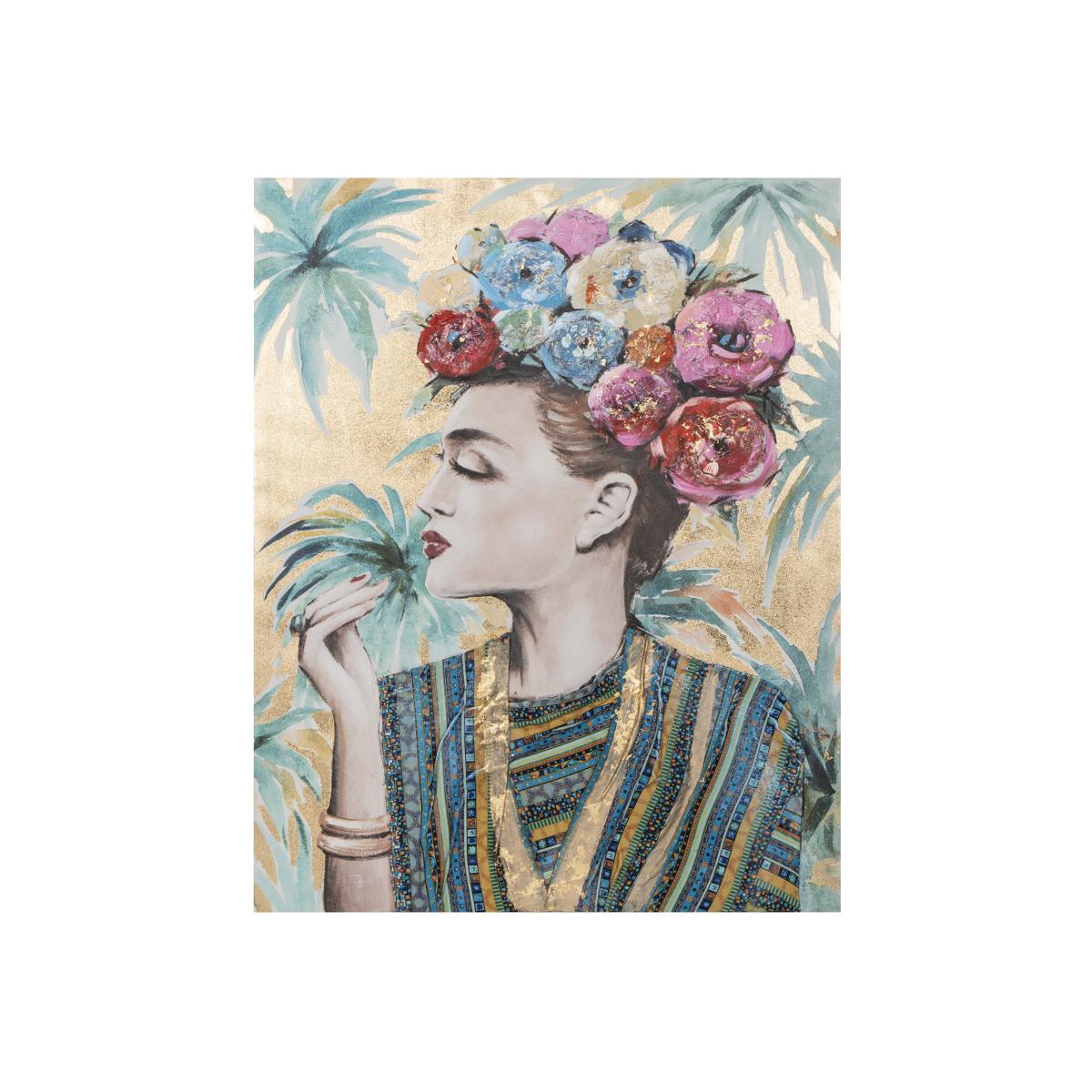 Show off your vibrant and exotic taste with this Flower Lady Portrait Art, featuring an array of lush tones and metallic gold detailing. Depicting an elegant lady posed against a leafy green and golden backdrop with intricately patterned clothing and a floral headdress, this artwork will look beautiful and striking on any wall.