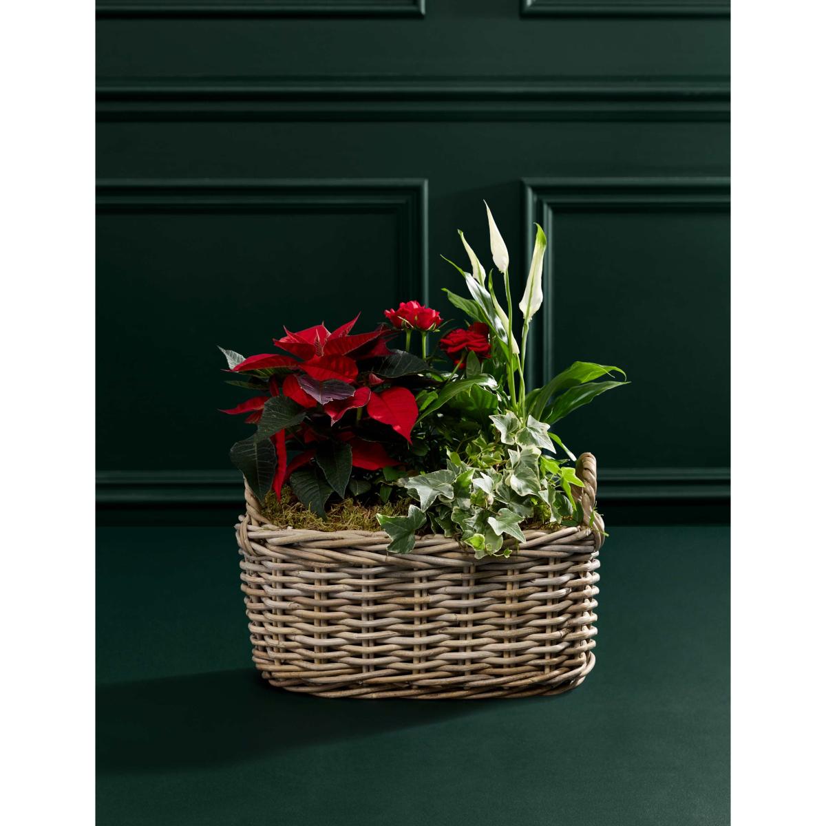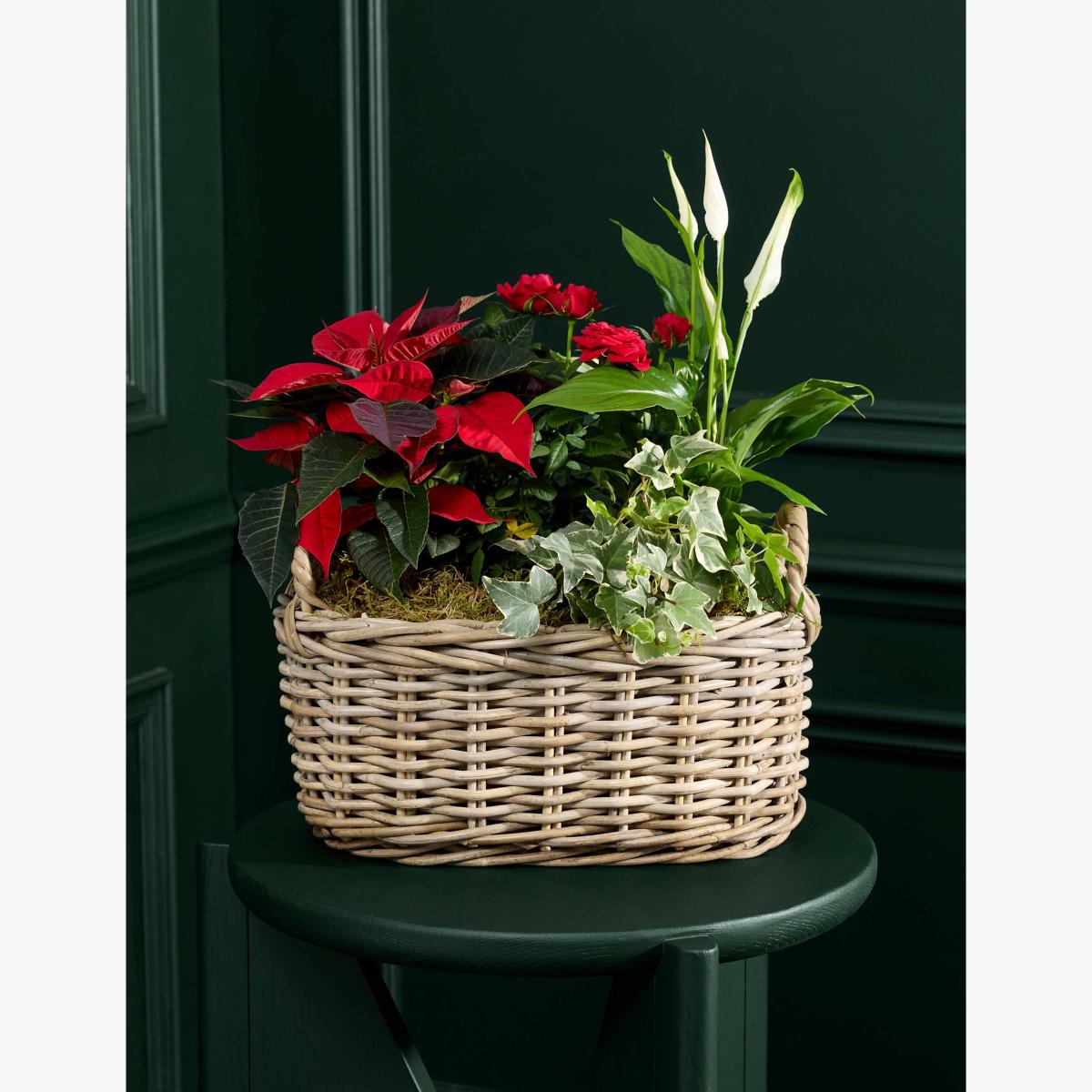 Celebrate the season with this stunning arrangement of festive red blooms and lush greenery, beautifully presented in a rustic Kubu basket. Featuring a vibrant Poinsettia, elegant Rose, graceful Peace Lily, and trailing Hedera, this mix brings texture, colour, and charm to your holiday décor. Perfect as a centrepiece or thoughtful gift, it’s a warm and welcoming way to add botanical beauty to any space this Christmas.