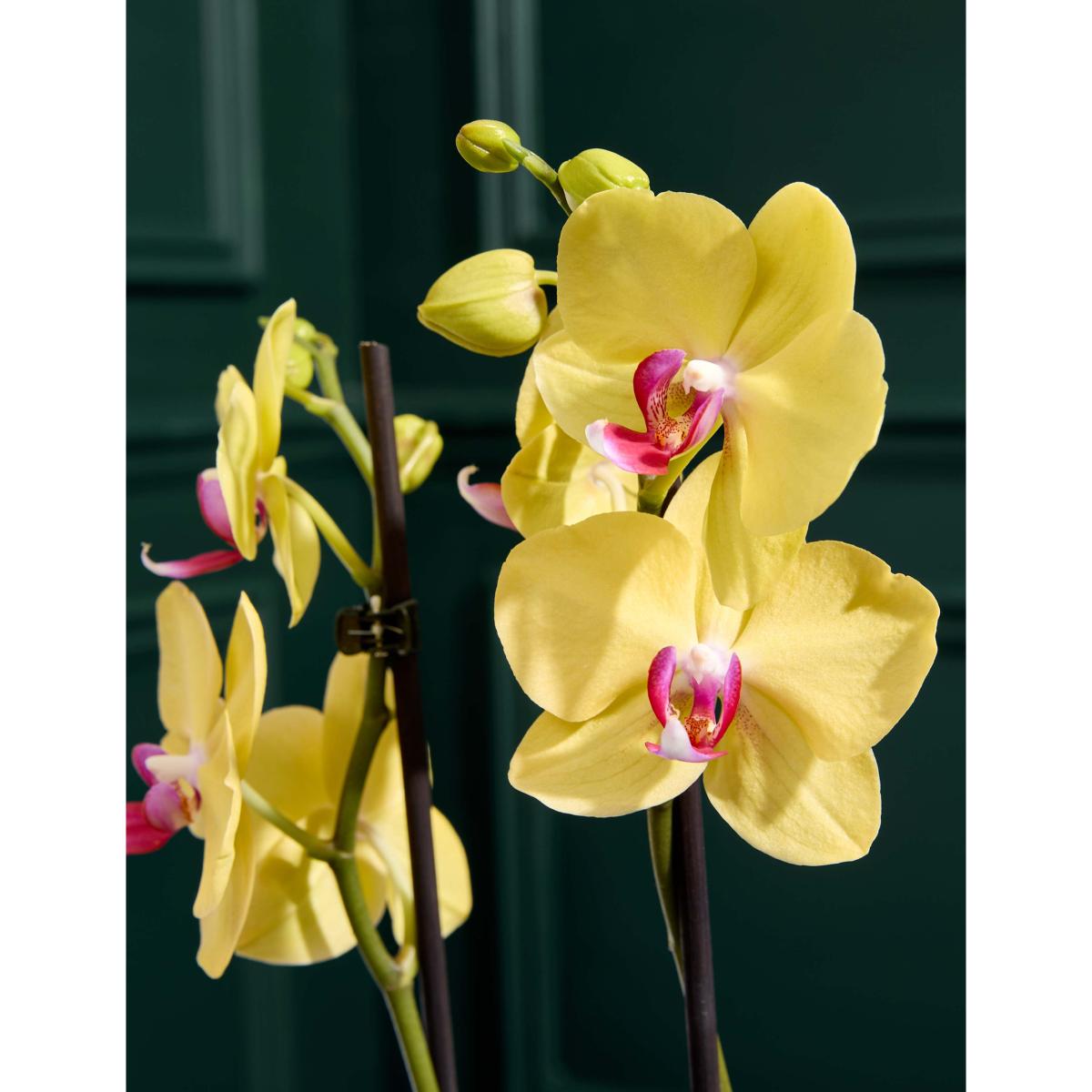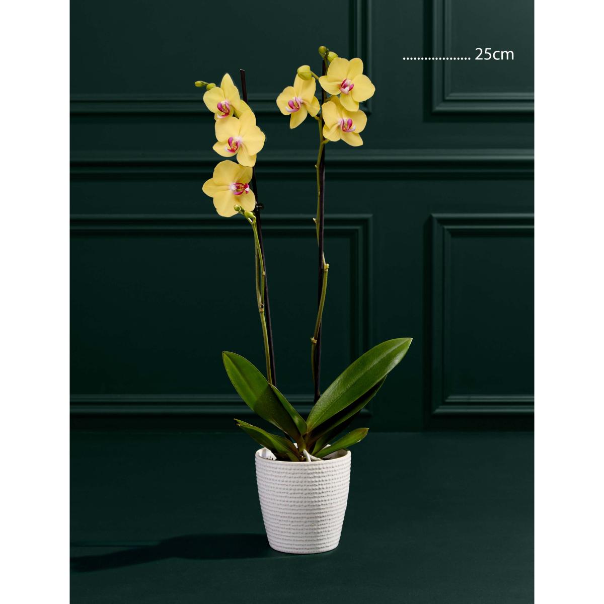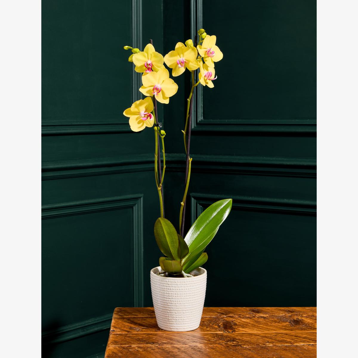 Bring sunshine indoors with this vibrant twin stem yellow Phalaenopsis orchid, radiating warmth and joy through its striking golden blooms. Set in a textured white ceramic pot, each piece is skillfully crafted in Portugal. Colours may vary slightly throughout the season.