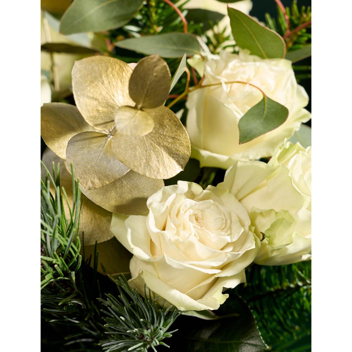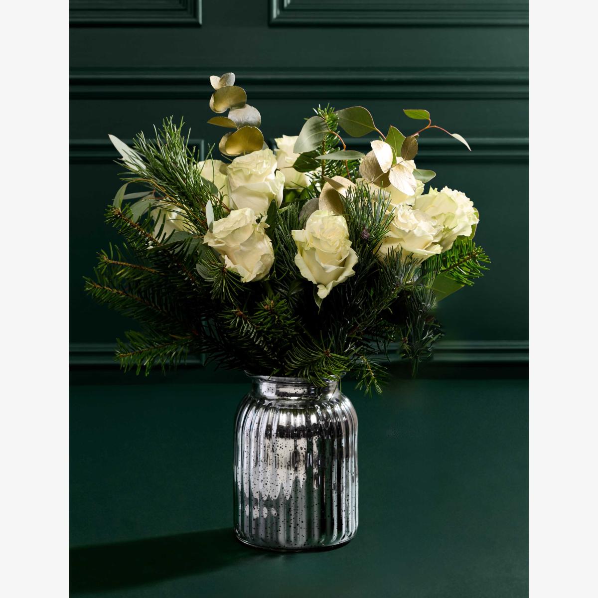 Welcome the festivities this year with this enchanting Christmas bouquet. If you want a really festive bouquet that you simply lift out of the box and onto the table, this will do you proud. Sensational white roses mixed with elegant foliage creates an exquisite fairytale look and feel to your home. The bouquet comes with a beautiful glass vase so you can instantly create a display. Flower colours may vary slightly throughout the season.