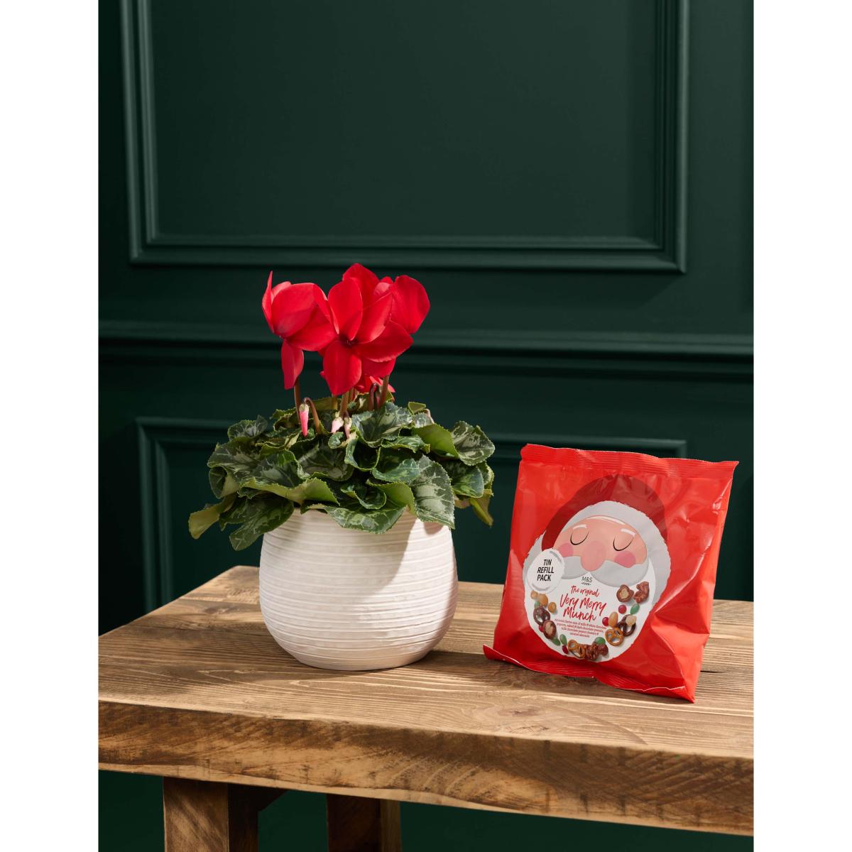 Add a seasonal splash of color to your home with our Red Cyclamen. Featuring vibrant crimson blooms and rich green foliage, this striking plant arrives in a stylish ceramic pot. It comes with a packet of delicious Very Merry Munch, a moreish mix of chocolate coated popcorn, chocolate pretzels, milk chocolate peanuts, caramel almonds and green candy-coated peanuts.