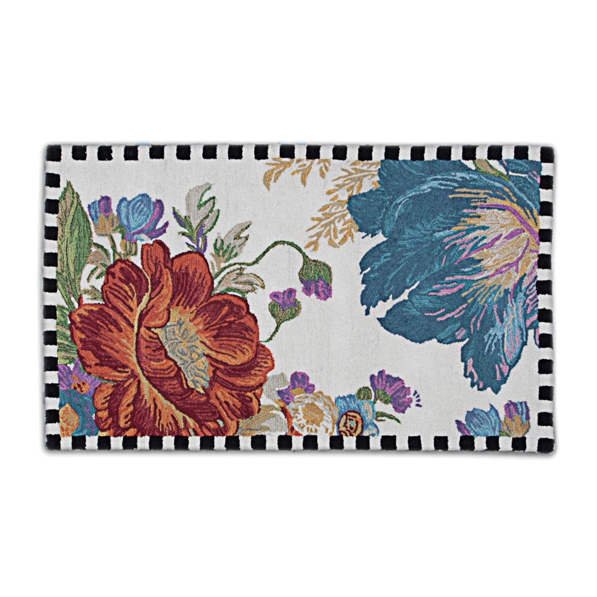 Give your interior an English country garden vibe with this ivory Flower Market Reflections Rug from MacKenzie-. Childs. Crafted from 100% wool, this eye-catching hooked rug features a checked border.