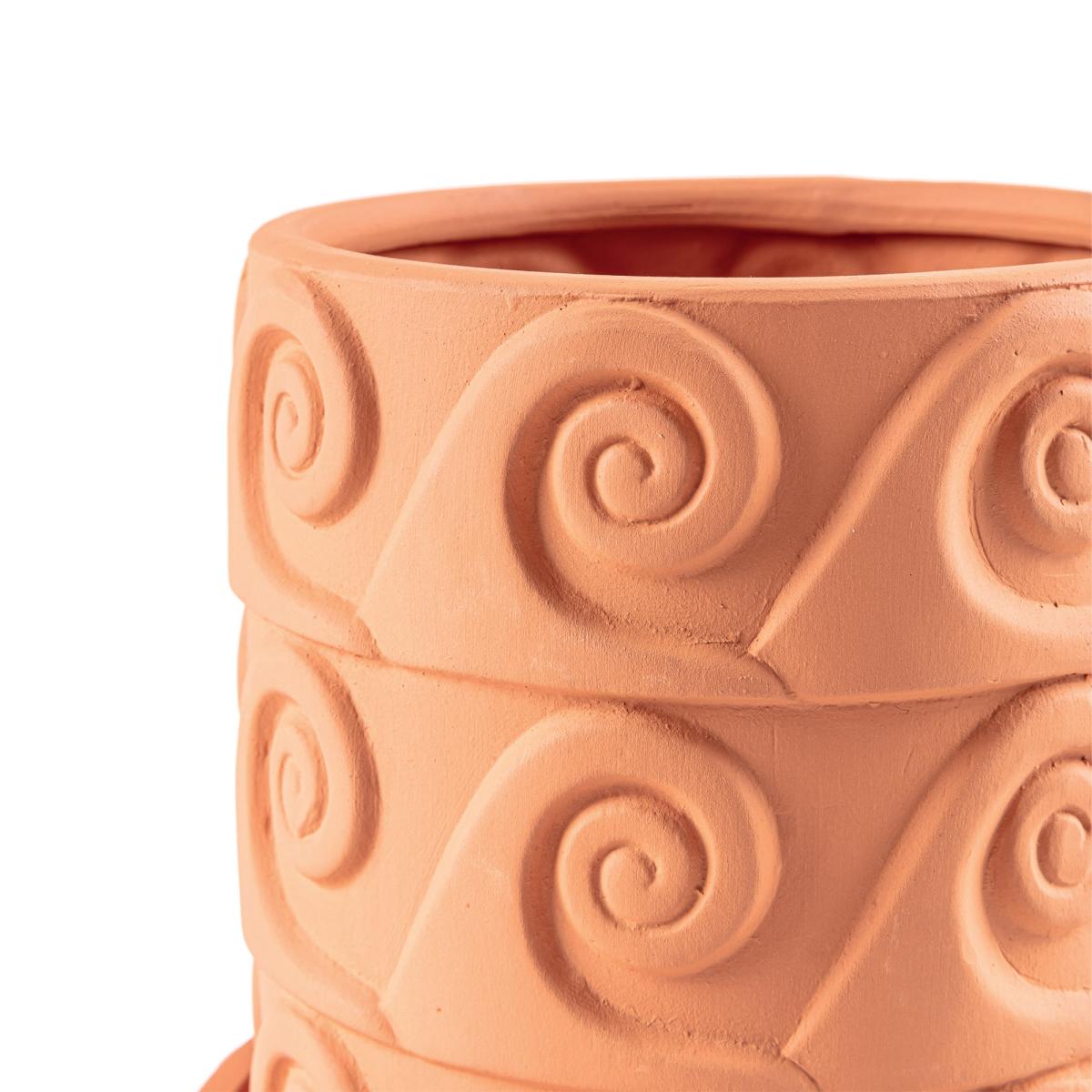 I love this flowerpot for its tactile, Greek-inspired design that adds a touch of sculptural interest to any space. Its soft terracotta hue makes it versatile, working well in neutral, boho, or rustic interiors, while also serving as a statement piece in more contemporary settings. The size (Ø 24 x H 23 cm) is perfect for centrepieces or to brighten up windowsills and shelves. Practical styling tips include pairing it with a variety of plant types-succulents for low-maintenance charm or trailing plants for added movement-and using the saucer as a base to protect surfaces, especially in open-plan spaces. Its textured surface also lends itself well to layered or eclectic displays, making it a great addition for creating a warm, inviting atmosphere.