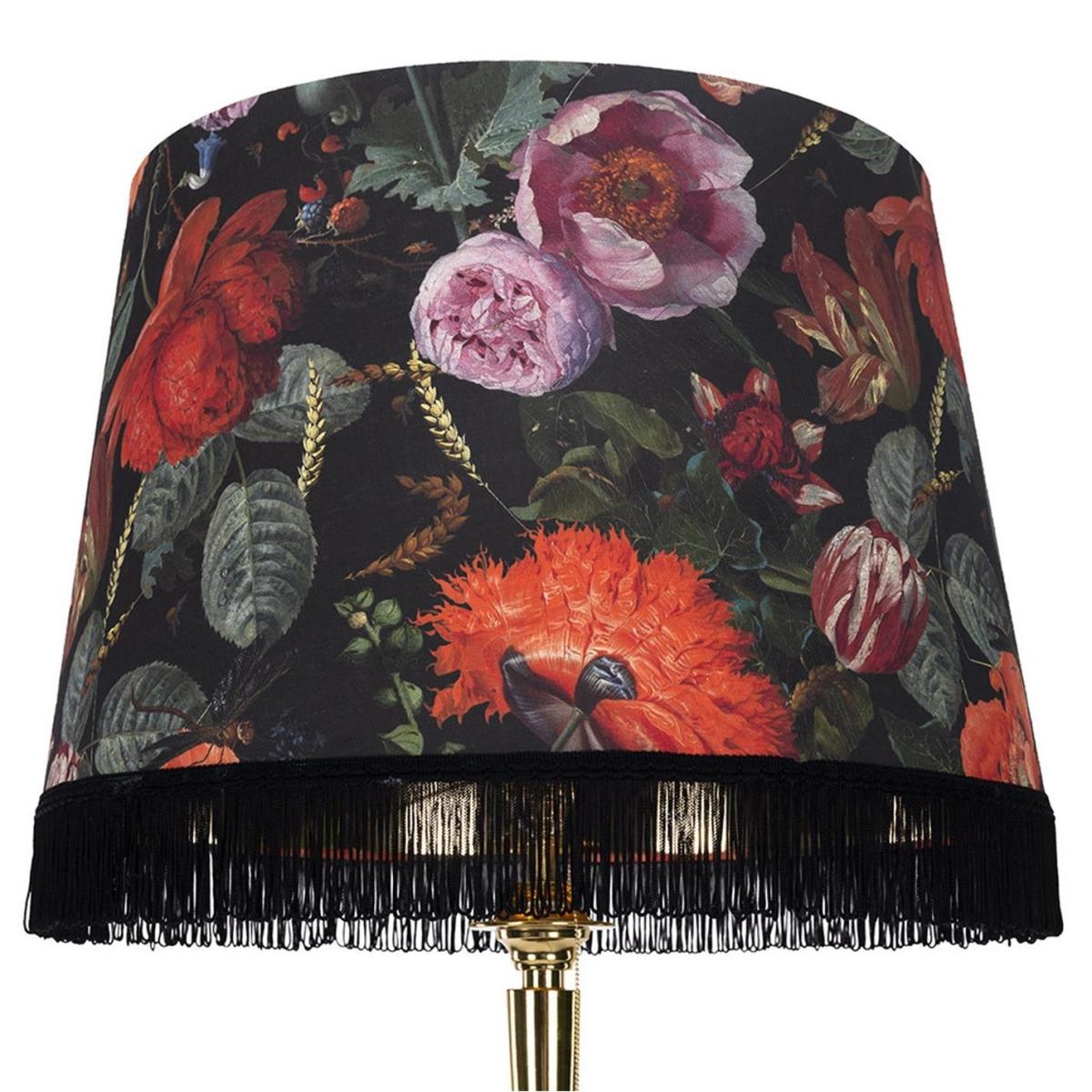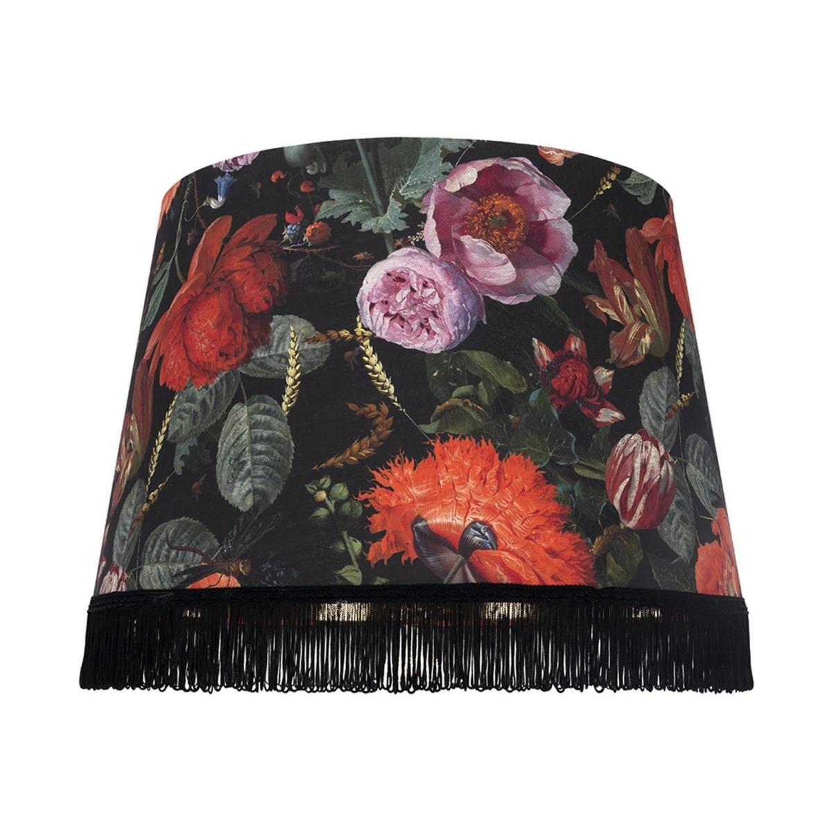 Add bold style to your home with this Flowers of the Lady lampshade from MINDTHEGAP. Featuring a beautiful pattern of red and pink toned flowers on a dark background, this design is finished with black feather styled fringing and a metallic gold lining. Available in small and large sizes this lampshade is for use for a table or floor lamp.