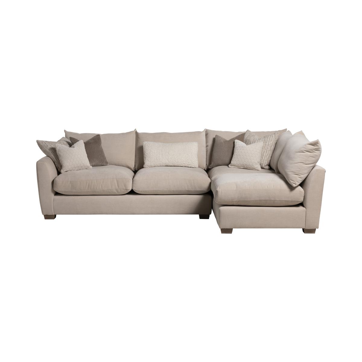 The Floyd Left Hand Corner Sofa brings British craftsmanship and premium materials together in a sleek, modular design. Feather and fibre-filled cushions provide luxurious comfort, while chrome feet add a modern touch. Featuring Superloop sprung back and seat suspension with hand-tensioned webbing, this sofa is perfect for a stylish, comfortable home.