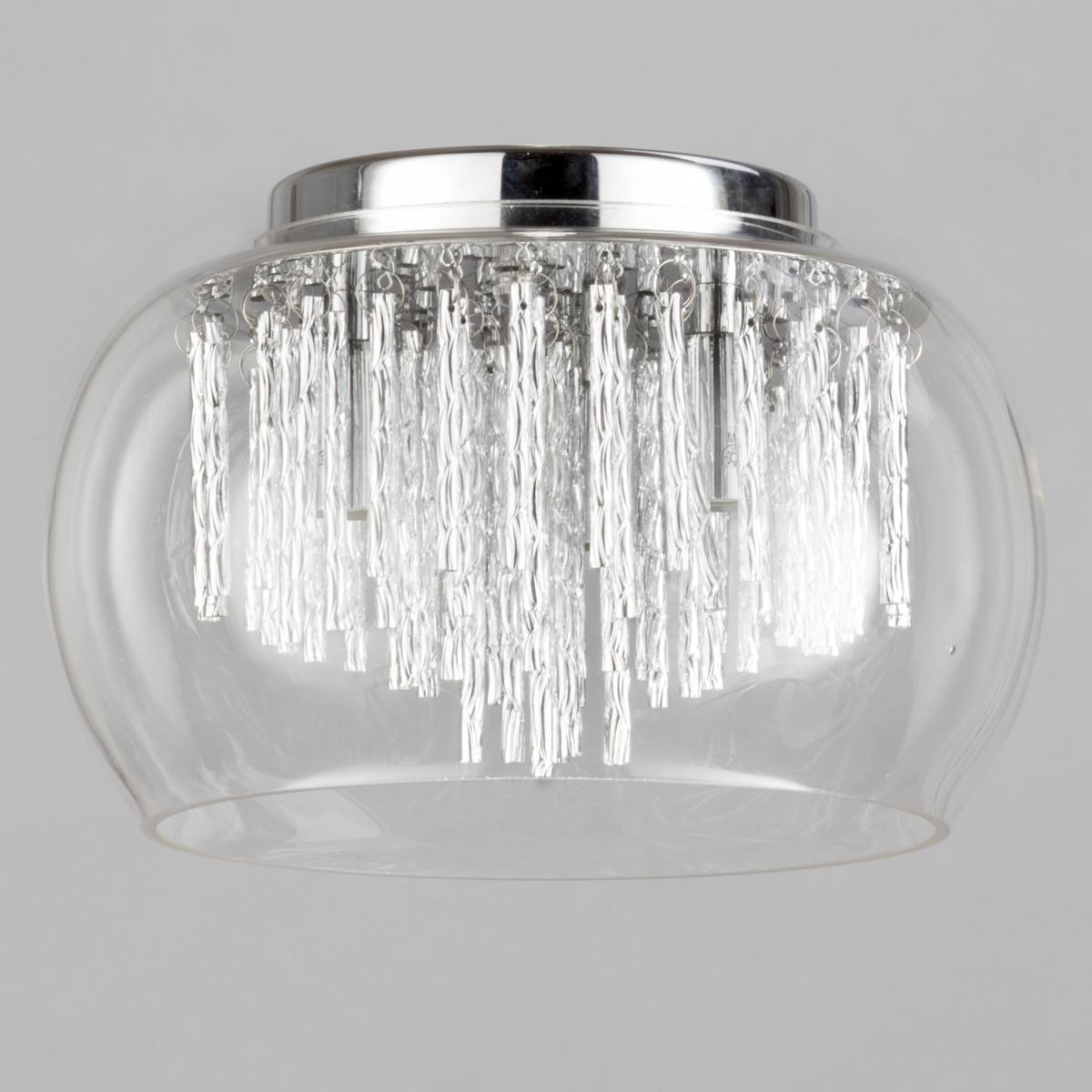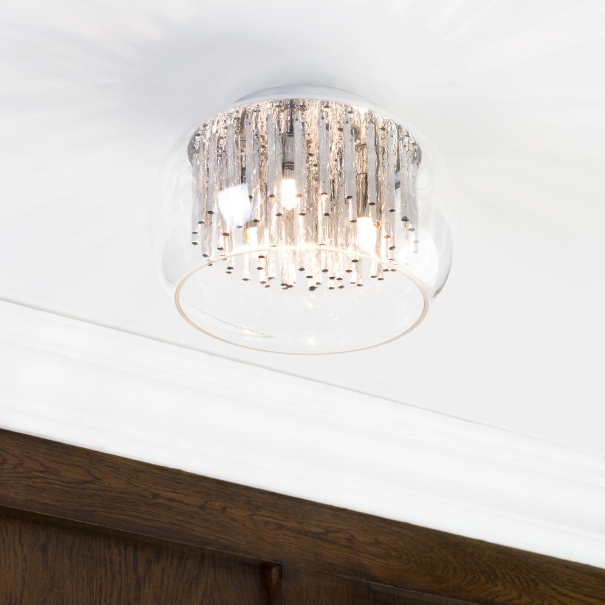 Illuminate your space with the stylish and modern 3 Light Flush Ceiling Bowl Shade with aluminium rods. Featuring chrome and glass construction, this flush ceiling light is ideal for low ceilings and combines sleek aesthetics with durability. The three light sources provide ample illumination, making it ideal for living rooms, bedrooms, or hallways.
