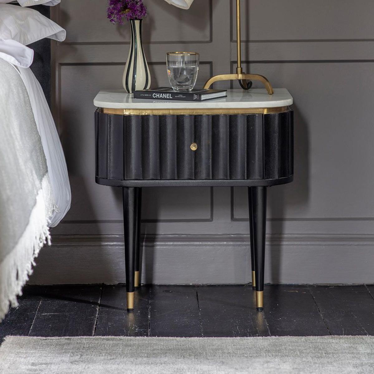 I’m a big fan of this fluted marble top bedside - the black finish with subtle gold detailing feels both modern and effortlessly luxe. It sits well in contemporary, Art Deco-inspired or monochrome schemes and brings a touch of structure thanks to its ribbed sides. For styling, keep the top clear of clutter: one sculptural lamp, a slim coaster and a small vase or stack of books. Tuck any charging cables behind the drawer for a neat look, and layer a soft rug underneath to balance the marble’s cool surface.