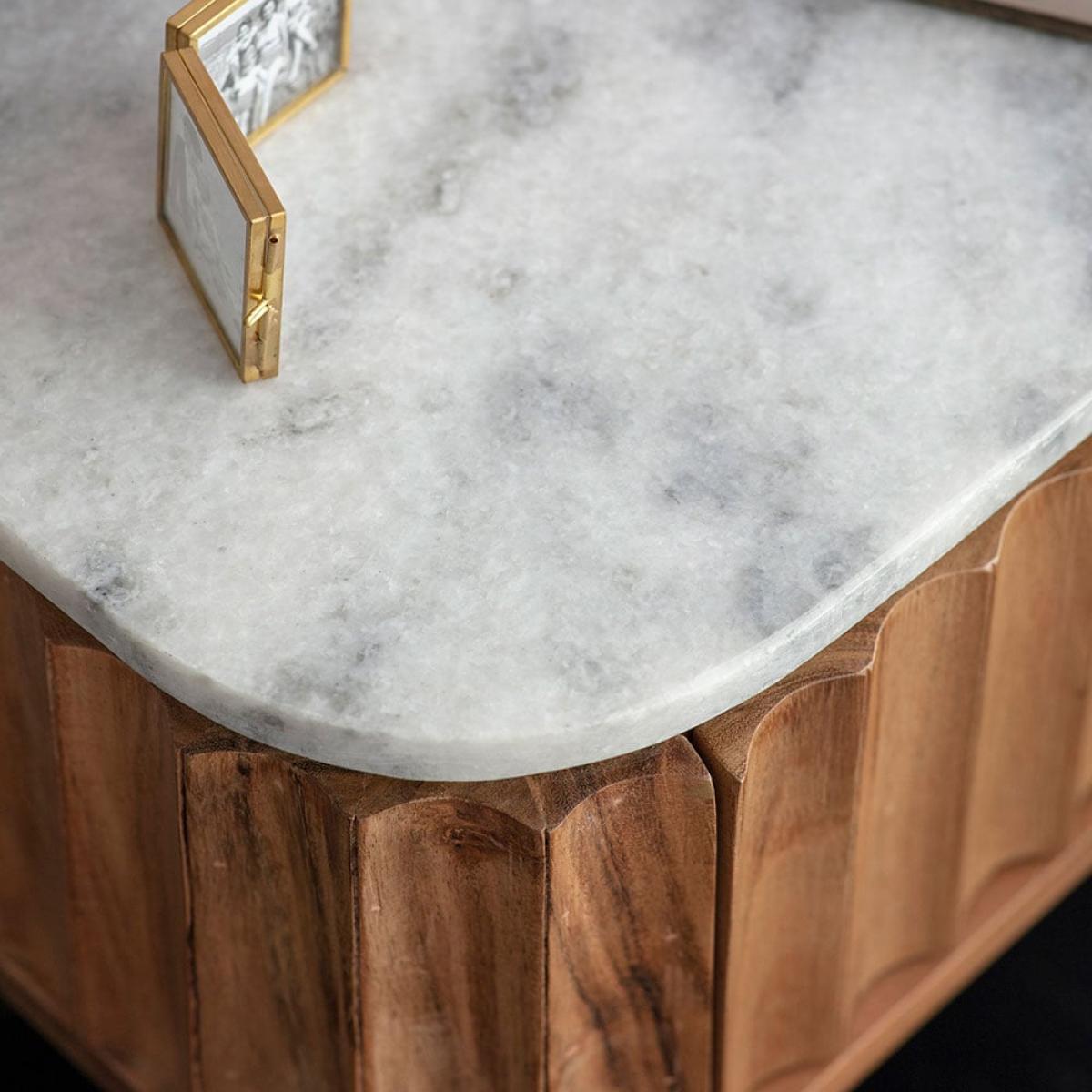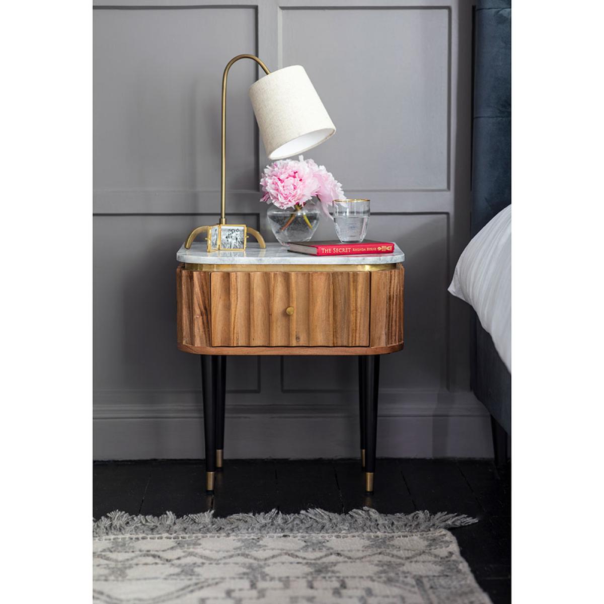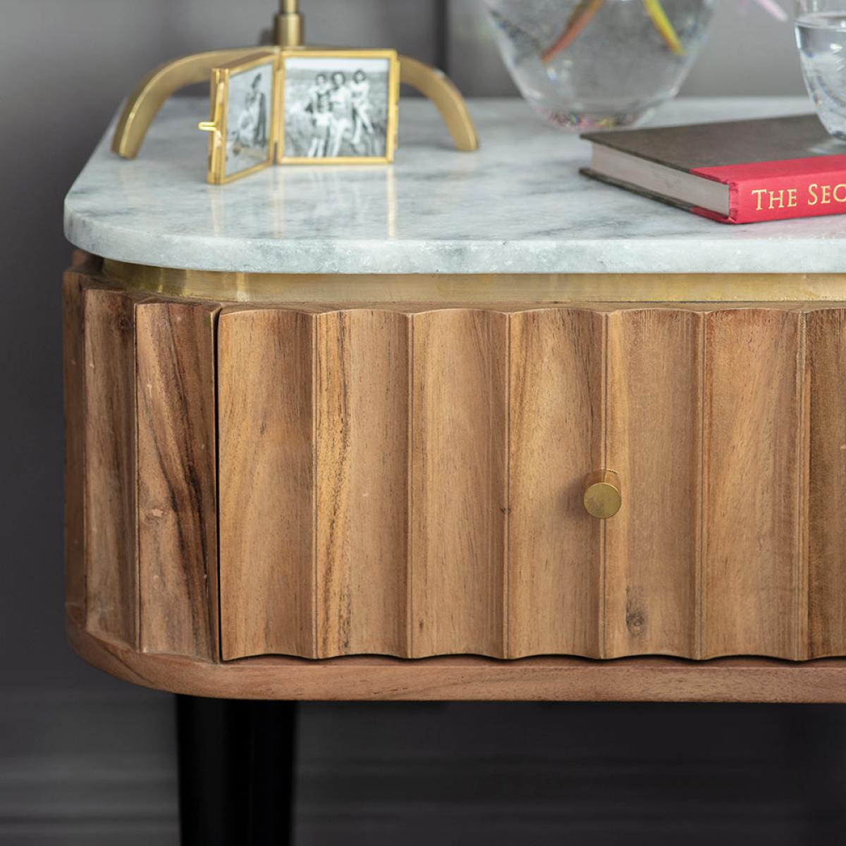 A perfect finishing touch to the bedroom or guest room, our Flute Marble Bedside Drawer comes in an on-trend acacia wood with white marble top and brass cladded edging. Combining the Mid-Century Modern look with a Scandinavian feel, it has one handy drawer for night-time essentials and black legs with brass caps for an elegant touch. Curved edges enhance the ergonomic appeal while one placed on either side of the bed adds symmetry to a refreshed bedroom scheme.