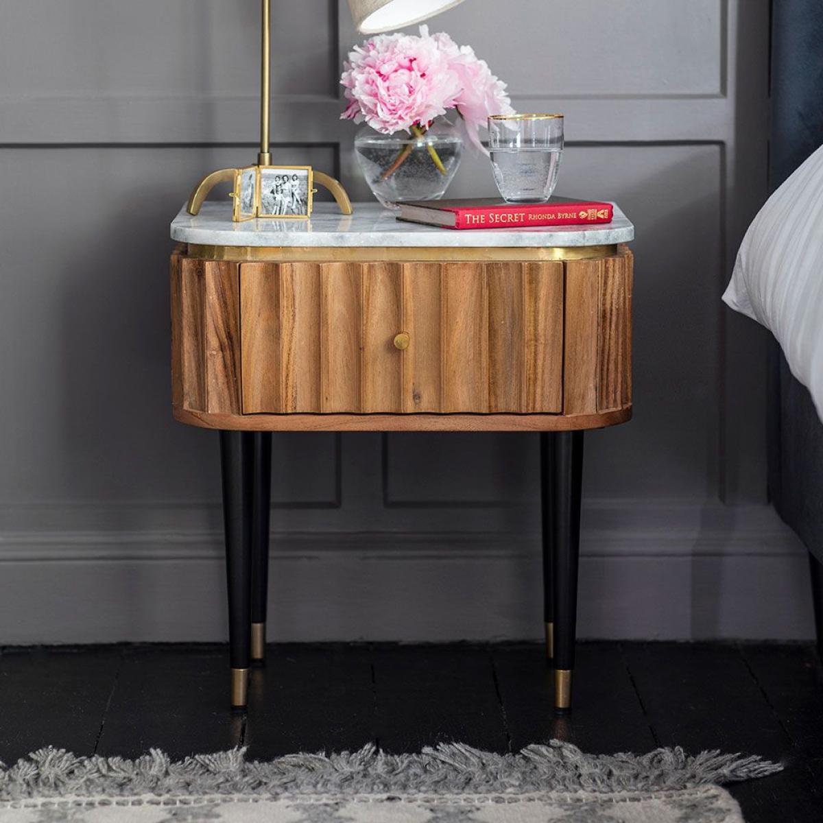 I’m a fan of this flute-fronted bedside - the sculpted teak and crisp carrara top bring a tactile warmth that still feels refined. Its slim, black-and-brass legs give it a subtle mid-century nod, so it pairs effortlessly with Scandi, contemporary or even an eclectic scheme. For styling, keep the surface light: a low-profile lamp, a small bud vase and a neat stack of bedside reads. Tuck cables behind to let the marble shine, and use the drawer to hide chargers or night-time essentials.