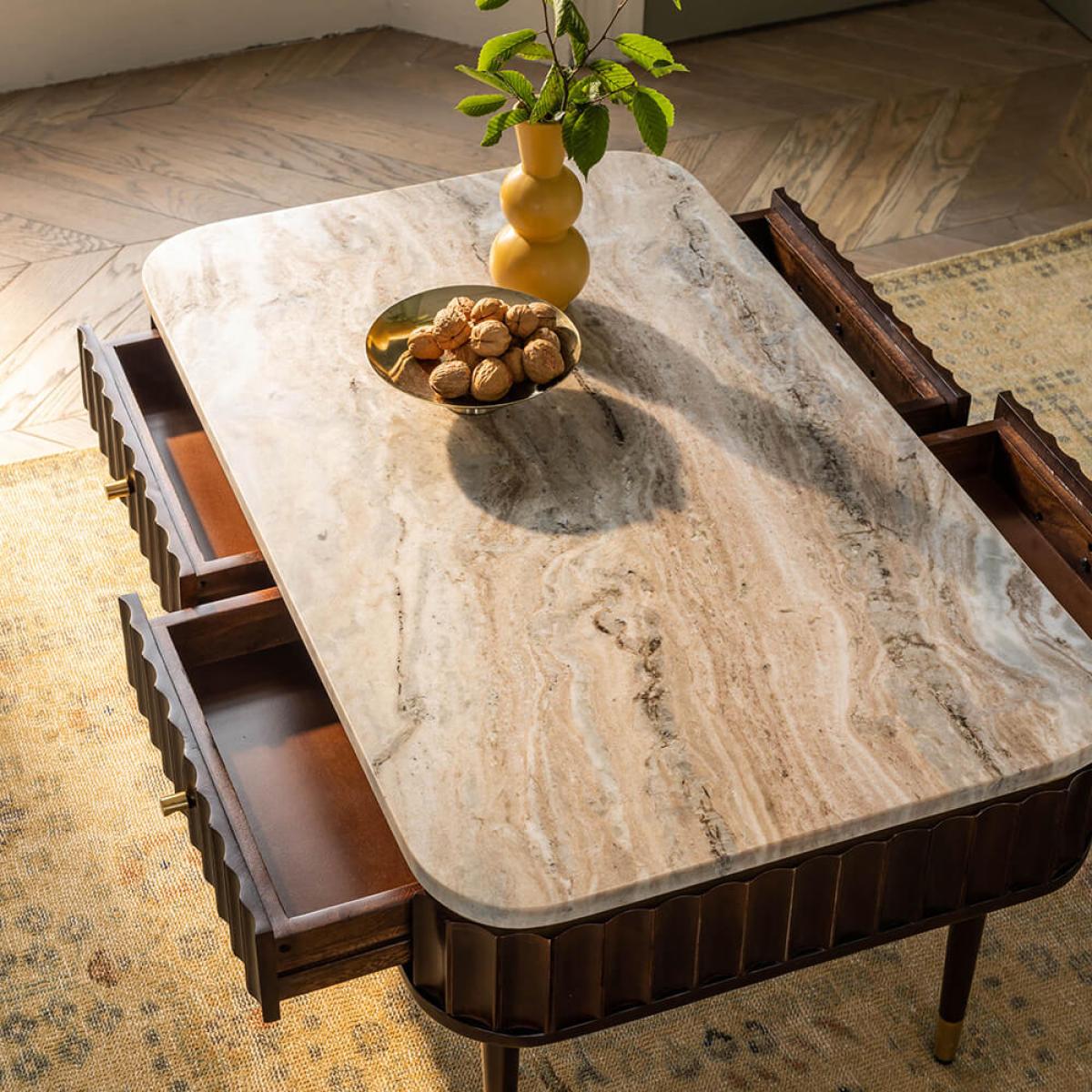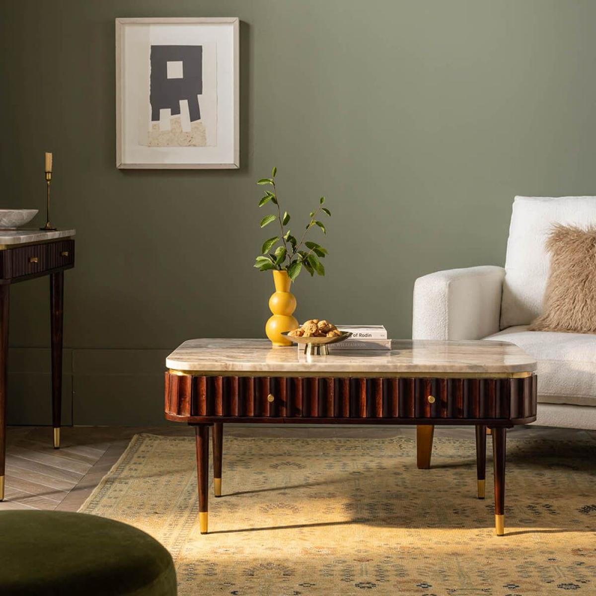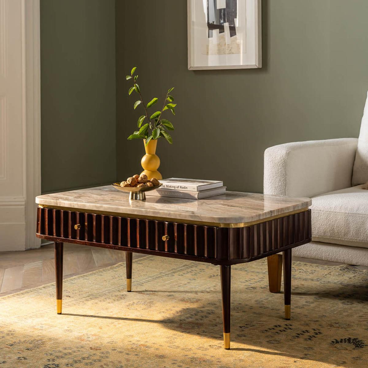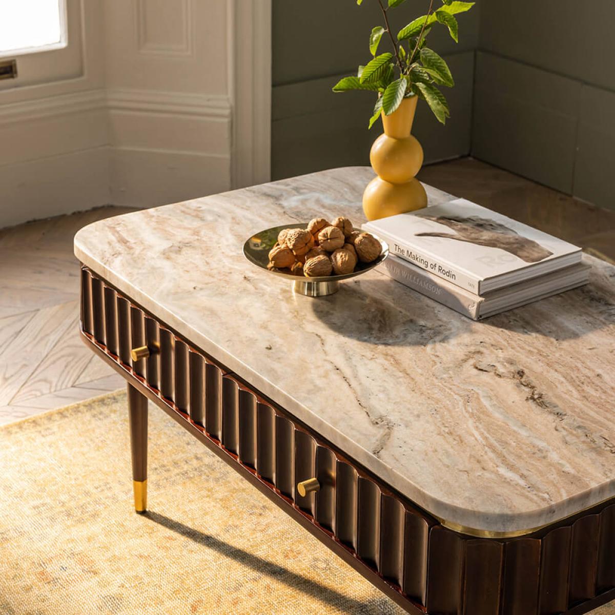 Combining vintage aesthetics with modern functionality, our coffee table with drawers and storage makes for a stylish centrepiece in any living room. Made from solid wood, the Flute features softly curved edges, fluted cabinetry – hence its name – stiletto legs and an opulent marble top. The antique-inspired dark stain of the wood and the mottled grey-and-coffee effect of the marble mean you’d be forgiven for thinking this low wooden coffee table was vintage. Further details come in gleaming brass accents, from clad edging to plated handles and capped feet, proving all that glitters isn’t just gold. But it’s not all aged good looks: generous storage is offered across four slimline drawers. Perfect for keeping things like remotes tidily out of view. Top with treasured coffee table books to add a finishing touch. Also available in a natural or black finish.