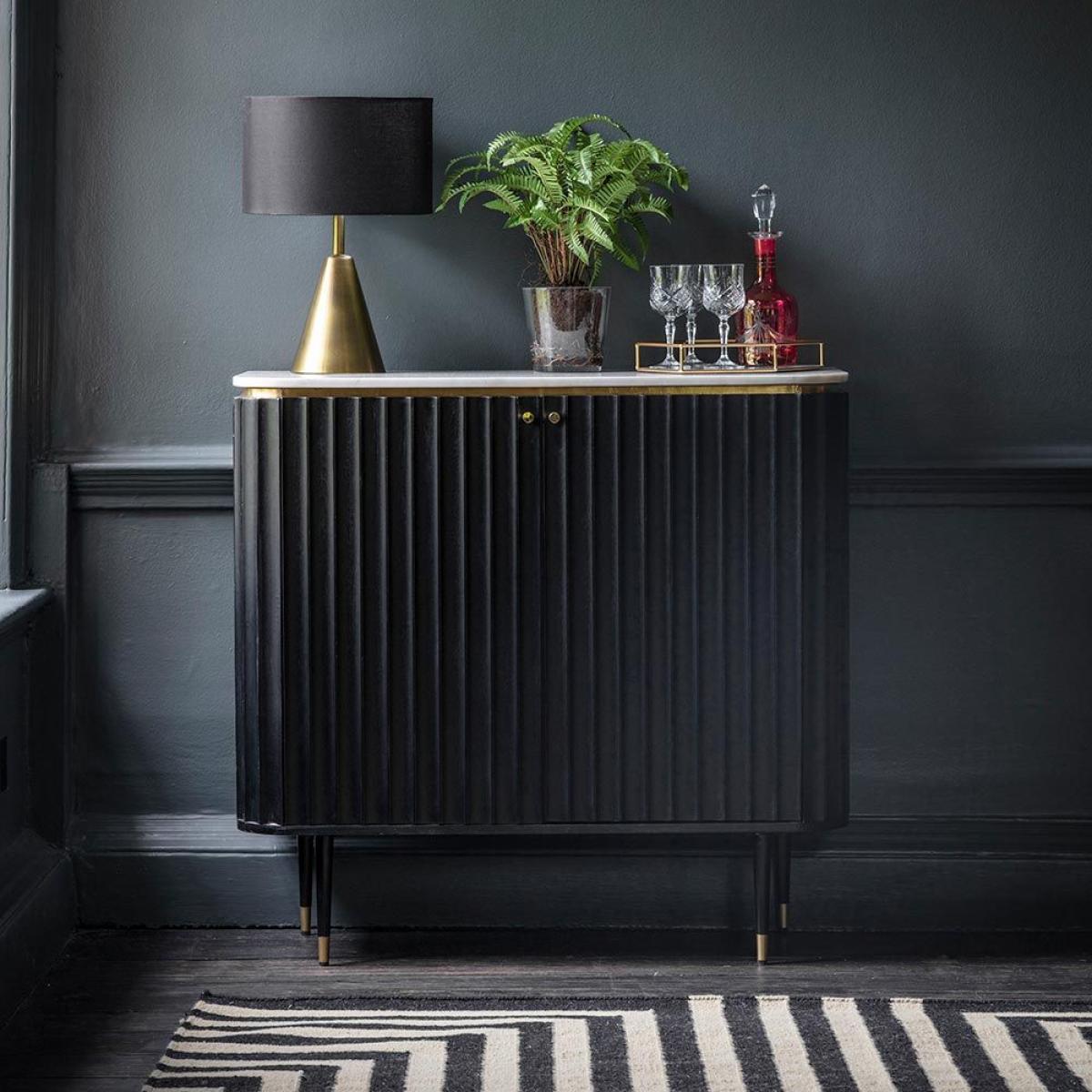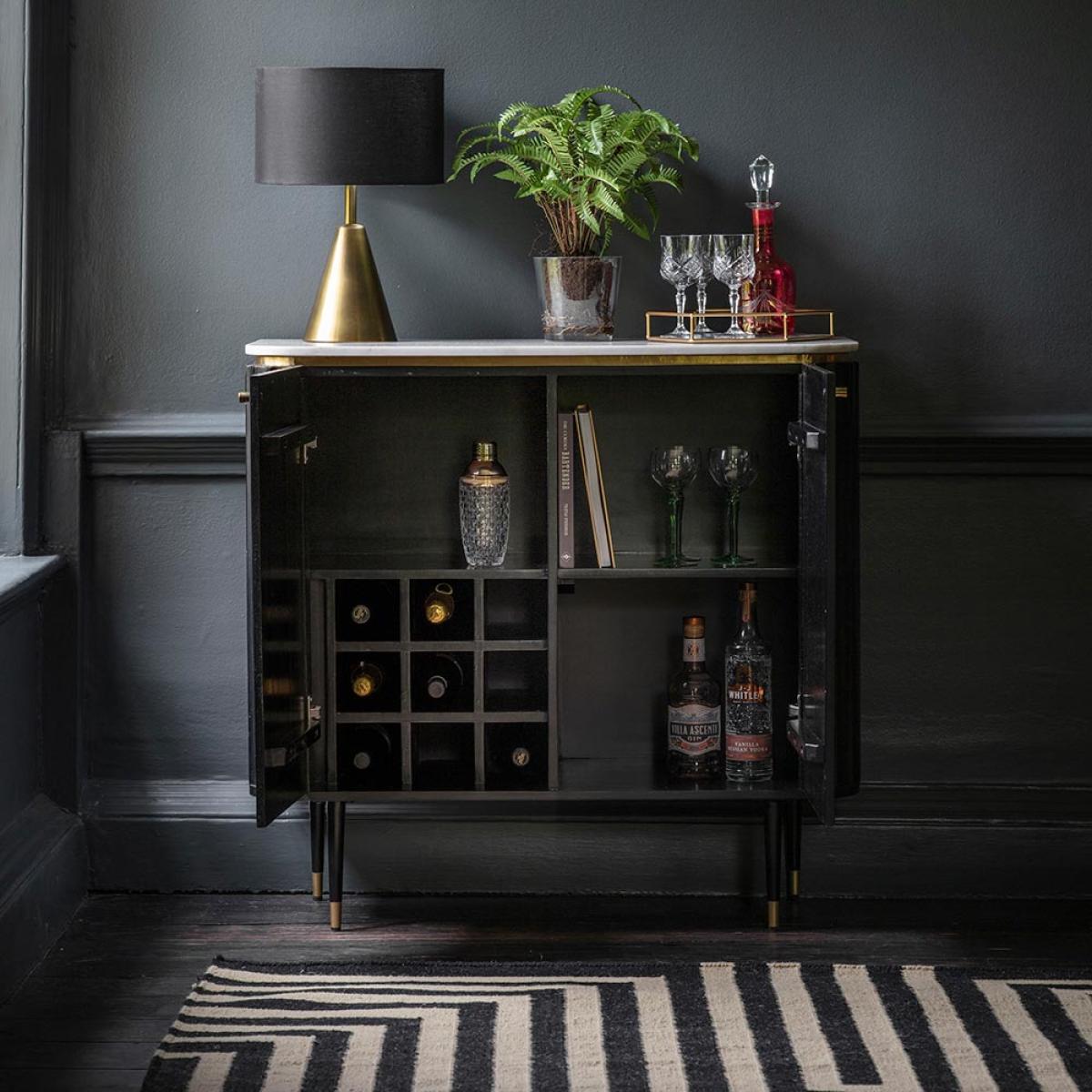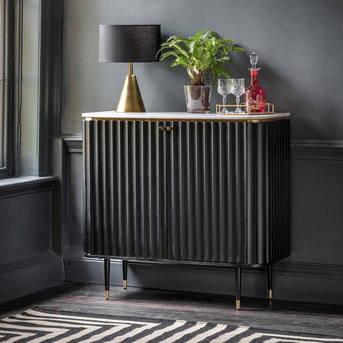 I’m a fan of this fluted drinks cabinet in black because its slim profile and ribbed detailing add interest without overwhelming a room. The subtle marble top and brass trim introduce a touch of luxury, making it a versatile choice for contemporary, Scandi-inspired or Art Deco interiors alike. To style it, keep the surface uncluttered: a small lamp, a low vase of greenery and a couple of statement decanters or tumblers are all you need. Inside, group glassware by type on different shelves and add a few sleek bar tools for easy access. In a hallway or living space, it doubles as a neat display unit and a practical drinks station.