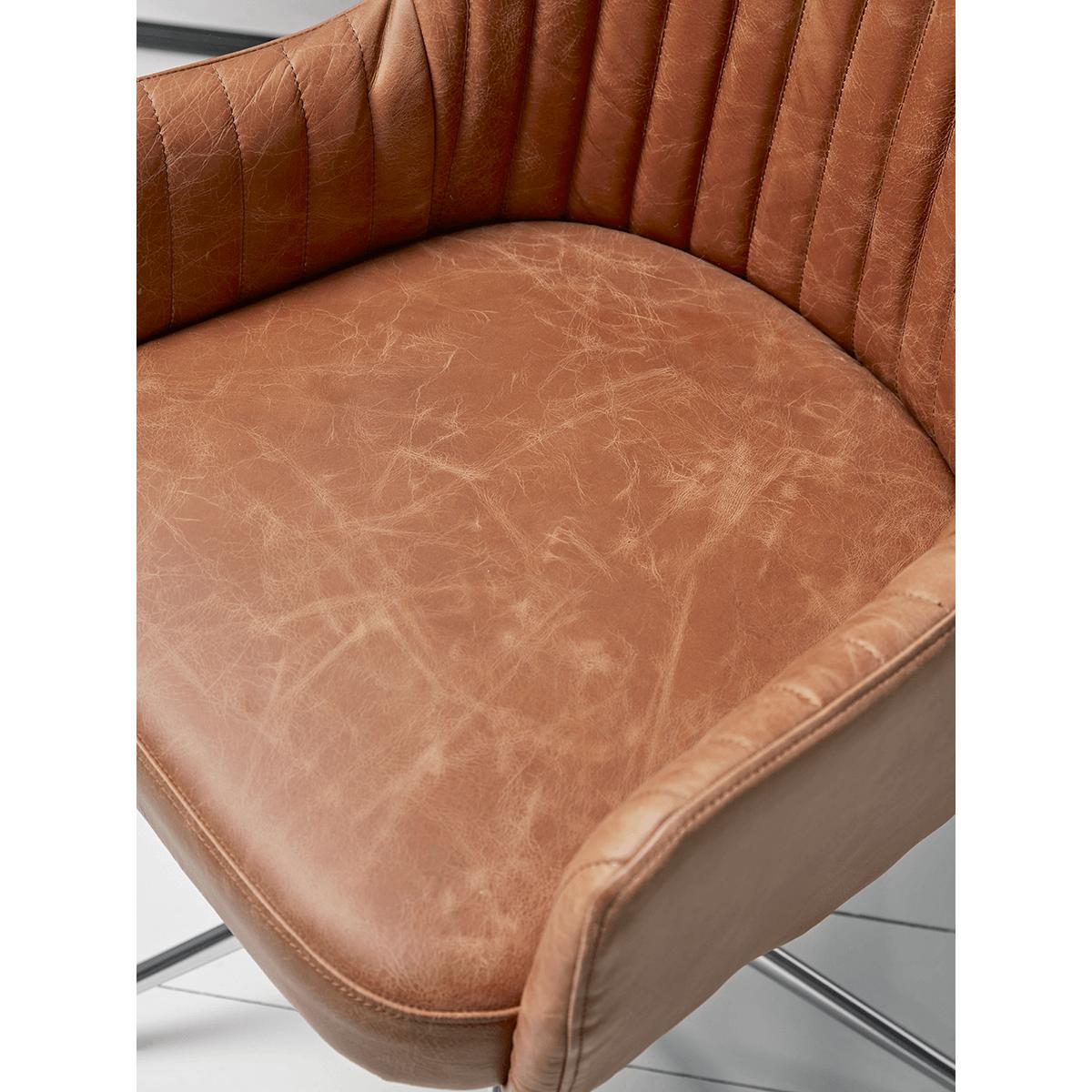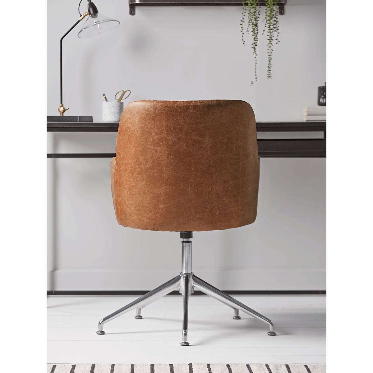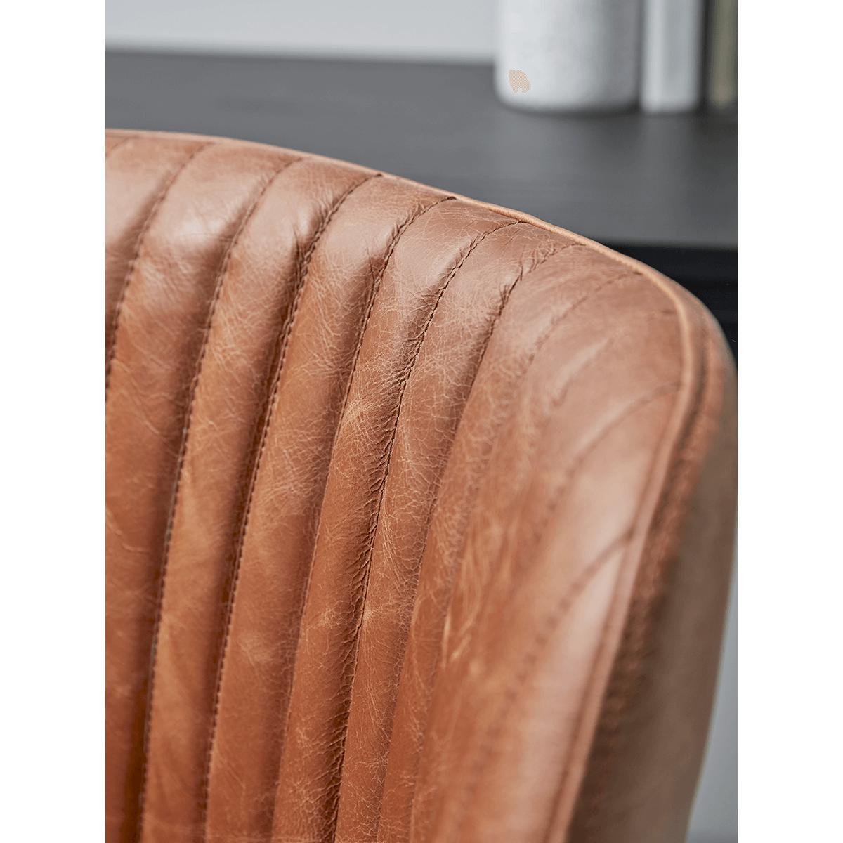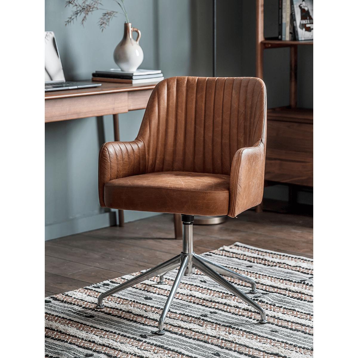 An elegant and contemporary office chair featuring a mid-century silhouette softened by fluted stitch detail. Wrapped in rich toned leather, the tall backrest and shaped arms of our chair provide a comfortable seat, while the solid metal frame and the sturdy mobile base provide the movement and versatility expected from your work chair. A must-have piece of furniture to serve any modern home for years to come.