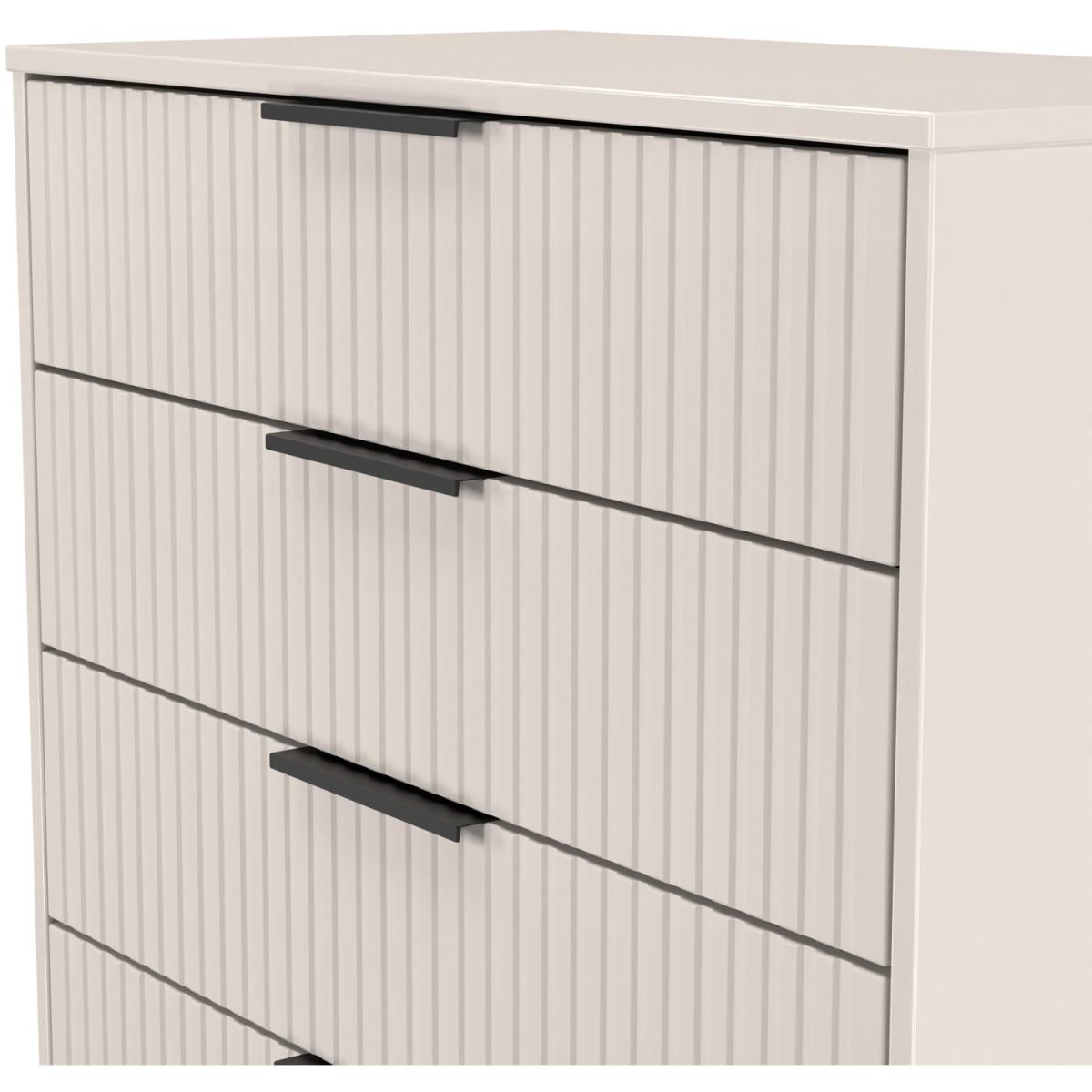 This wide 4 drawer chest of drawers is practical and stylish. Perfect for any home as a free standing storage unit. A new stand out range, named for the new deep cut "fluted" grove patten of the drawer and door fronts. Featuring black metal handles and black sleigh legs. A striking and individual range that is perfect for the modern home. All our furniture is made in the United Kingdom, to the highest quality using responsibly sourced materials. It is delivered direct to your location of choice by one of our two man delivery teams, and comes fully assembled (although items with legs will have those legs removed during transit to avoid damage).