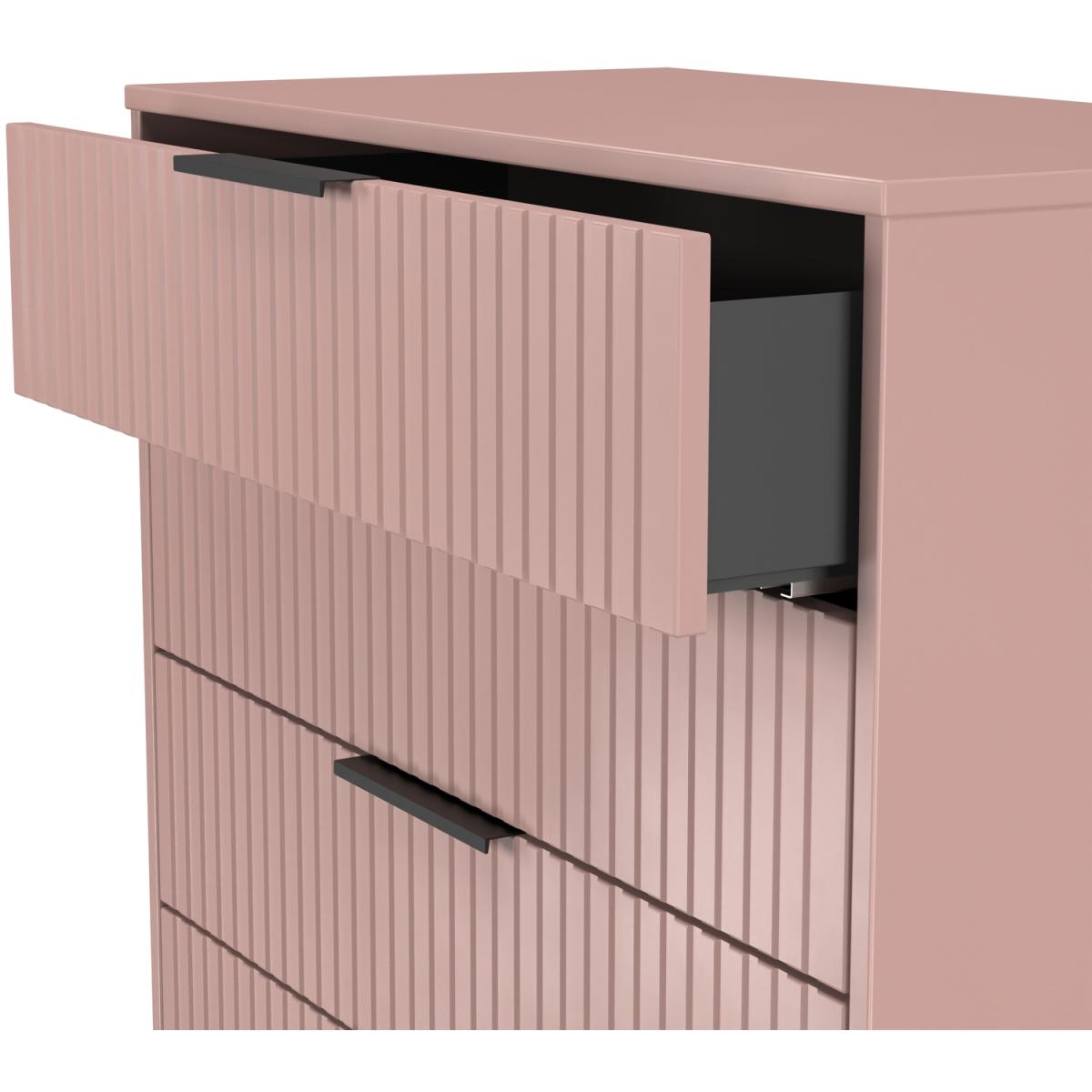 This wide 4 drawer chest of drawers is practical and stylish. Perfect for any home as a free standing storage unit. A new stand out range, named for the new deep cut "fluted" grove patten of the drawer and door fronts. Featuring black metal handles and black sleigh legs. A striking and individual range that is perfect for the modern home. All our furniture is made in the United Kingdom, to the highest quality using responsibly sourced materials. It is delivered direct to your location of choice by one of our two man delivery teams, and comes fully assembled (although items with legs will have those legs removed during transit to avoid damage).