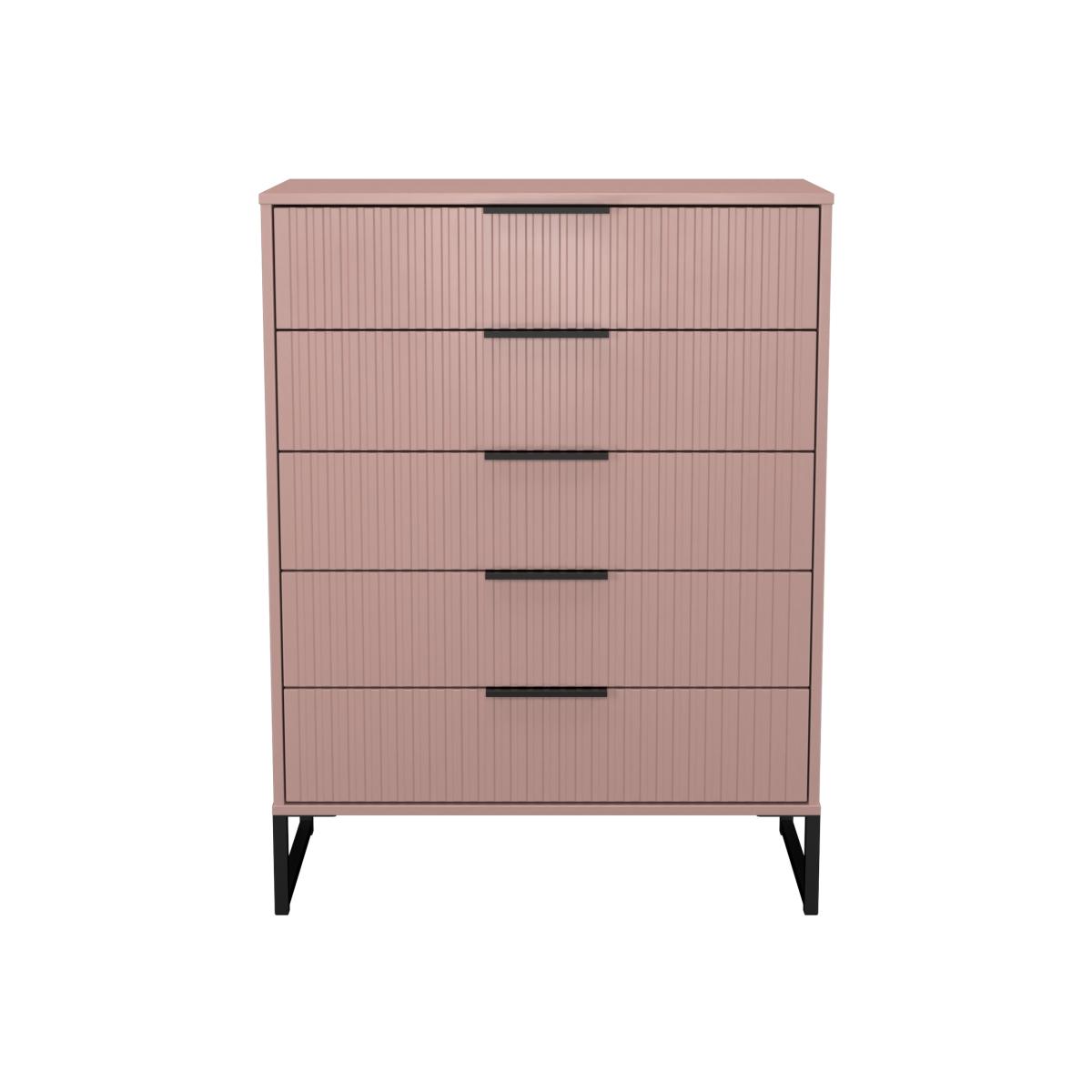This wide 5 drawer chest of drawers is practical and stylish. Perfect for any home as a free standing storage unit. A new stand out range, named for the new deep cut "fluted" grove patten of the drawer and door fronts. Featuring black metal handles and black sleigh legs. A striking and individual range that is perfect for the modern home. All our furniture is made in the United Kingdom, to the highest quality using responsibly sourced materials. It is delivered direct to your location of choice by one of our two man delivery teams, and comes fully assembled (although items with legs will have those legs removed during transit to avoid damage).