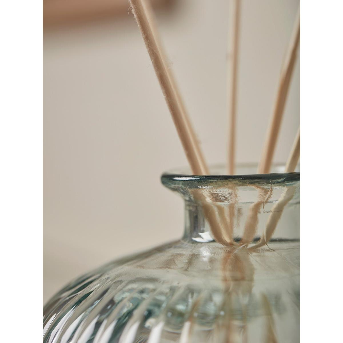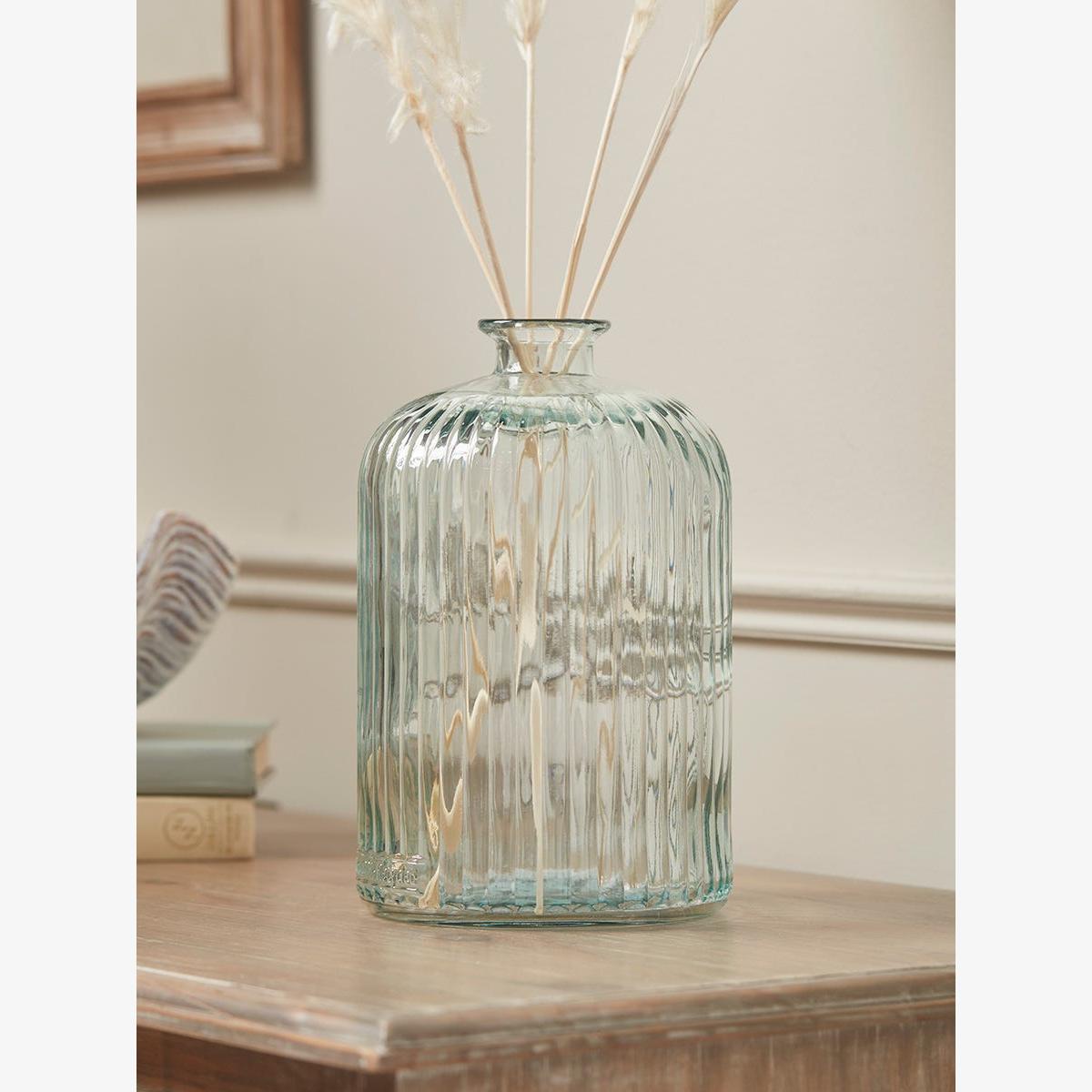 With a hint of vintage apothecary shop about it, this bottle shaped vase has a wide body and statement reeded sides which will catch the light beautifully. The short flared neck and small mouth are perfect for supporting taller stems.