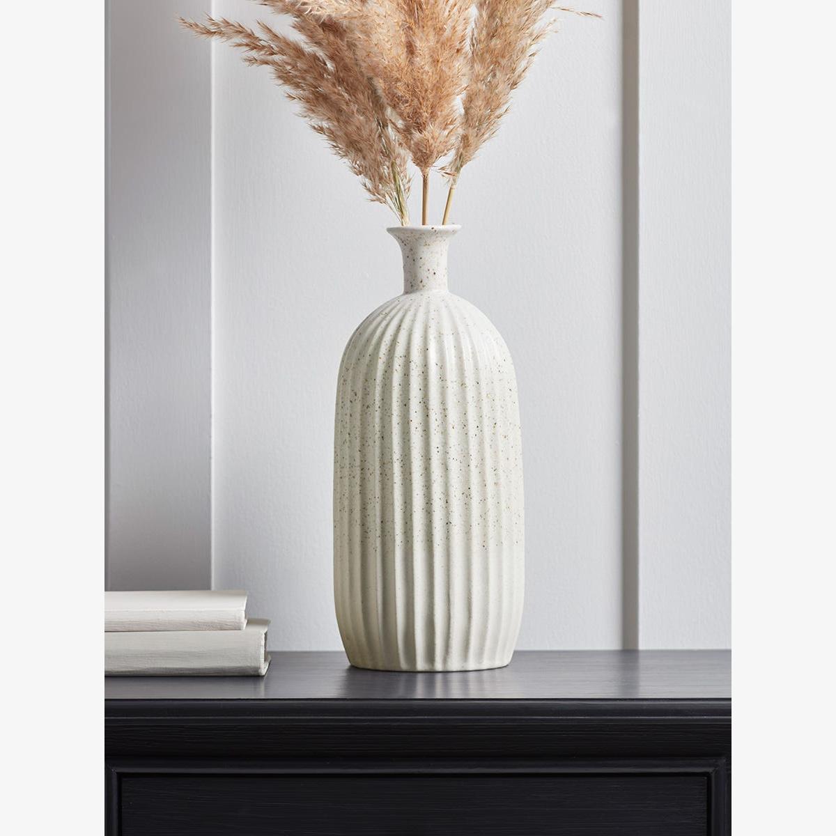 I love the textured vibe of this vase; its fluted surface adds visual interest without feeling too ornate. It works particularly well in contemporary or minimalist interiors, where its sculptural quality can stand out, but it also complements more eclectic spaces thanks to its earthy tone and tactile feel. For styling tips, consider filling it with neutral or dry florals to keep things understated or using it as a standalone statement piece on a mantle, sideboard, or entryway table. Its tall, slender shape makes it perfect for grouping with other ceramic or textured accents, creating a layered, curated look with minimal effort.