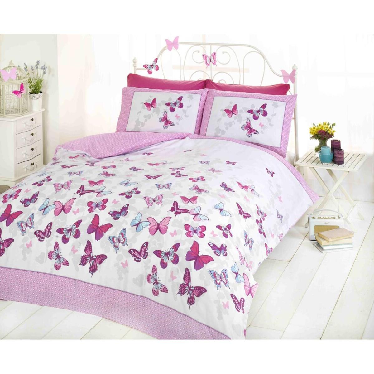 Butterflies flutterbyon this pink, purple, blue and white modern themed bedding. Perfect for any nature lover. A light pink and white pattern adorns the back, meaning this reversible bedset has 2 fashionable designs for the price of one. The polycotton material gives this duvet cover the natural breathability of cotton, with the durability of polyester.