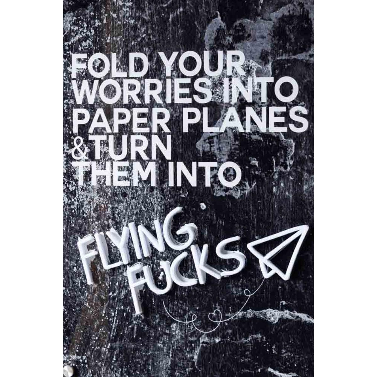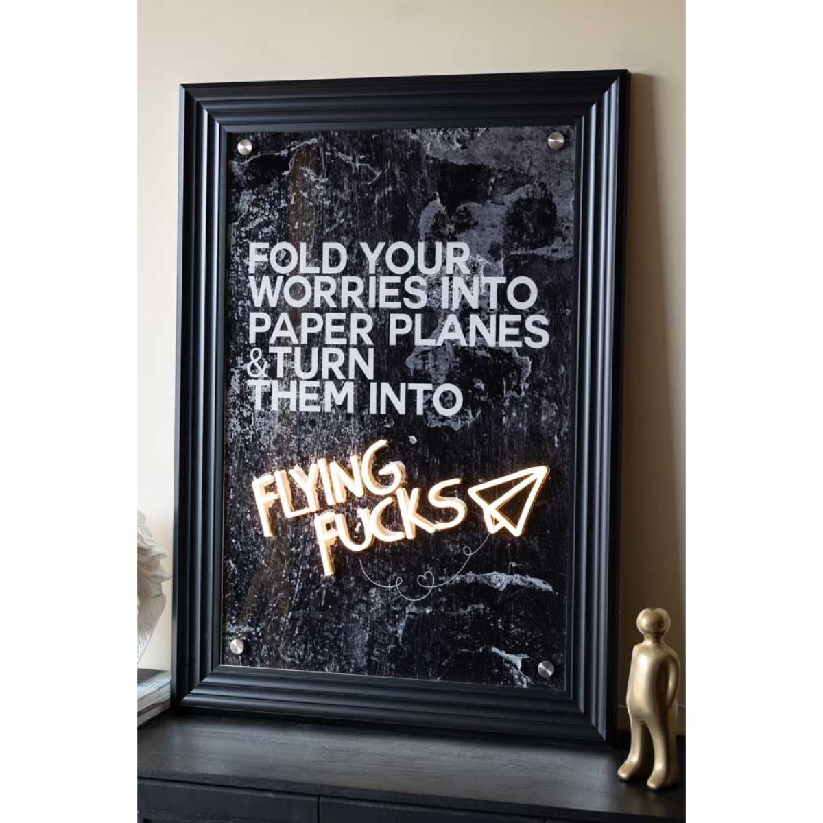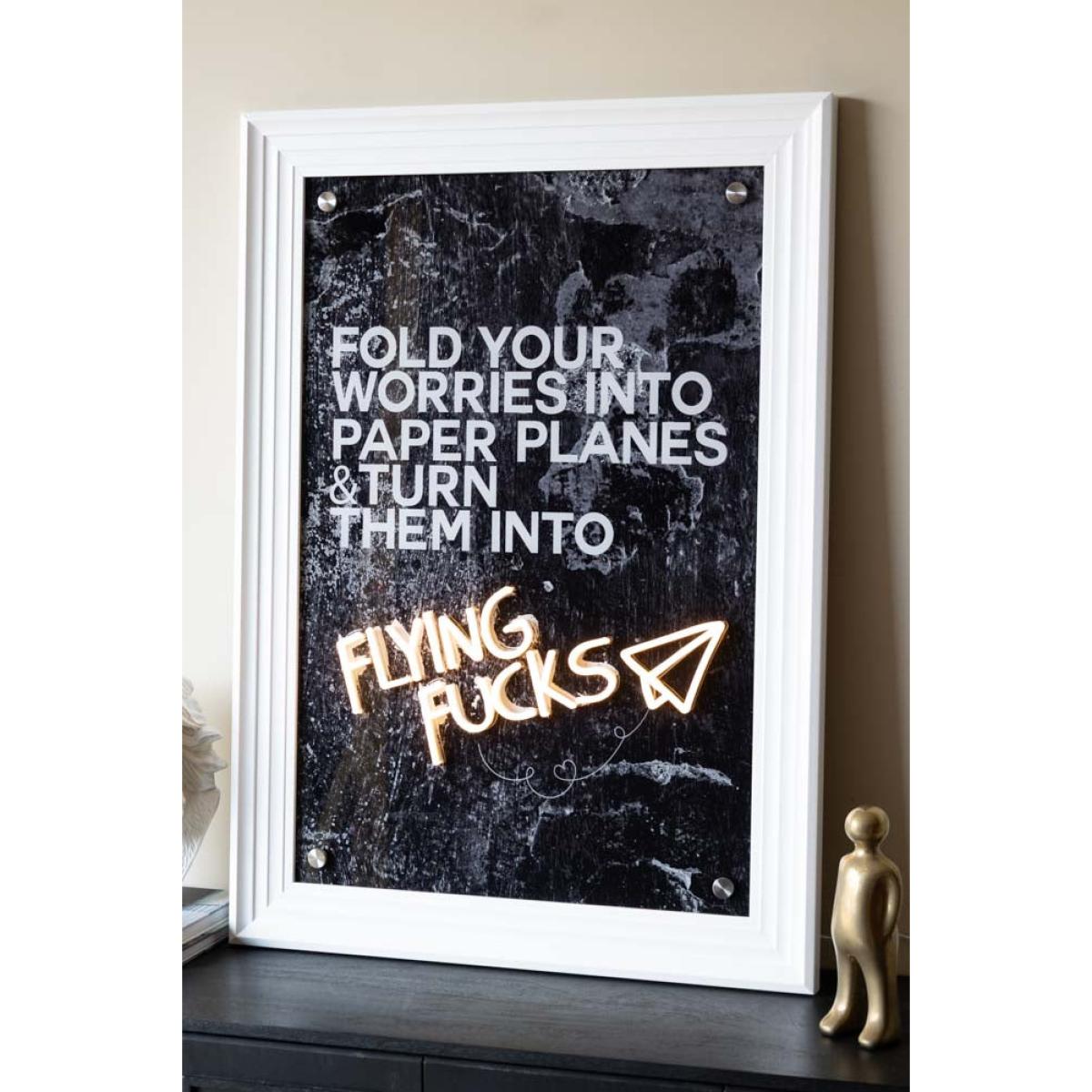 Fold those worries up and send them flying. This punchy little neon wall light is here to help you channel your inner ‘not bothered’ energy. With a bold abstract black and white backdrop and the cheeky mantra ‘fold your worries into paper planes & turn them into flying fucks’, this quirky wall art is the perfect combo of calm wisdom and unapologetic sass. The best part? The phrase ‘Flying Fucks’ is lit in glowing LED neon, complete with a cute little paper plane illustration. Available in a classic black or white frame, it’s made to stand out amongst neon signs and wall lights and shut down any bad vibes. Hang it loud and proud – because you’re too beautiful to worry. - Flying Fuck Framed Neon Wall Light - Measures: W60cm x H90cm - Materials: Acrylic - Comes with an adaptor plug, wall fixings and remote control.