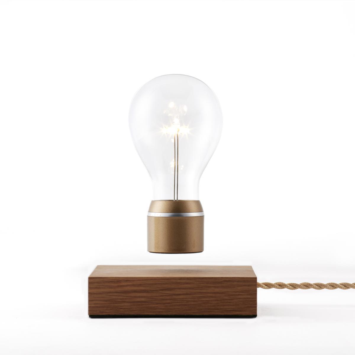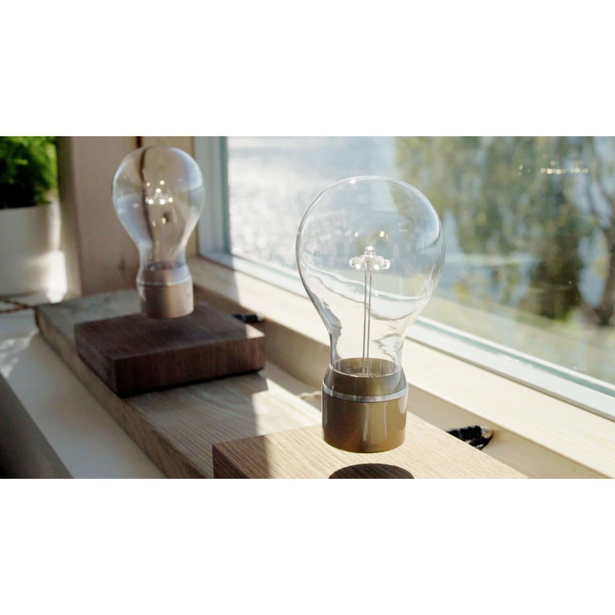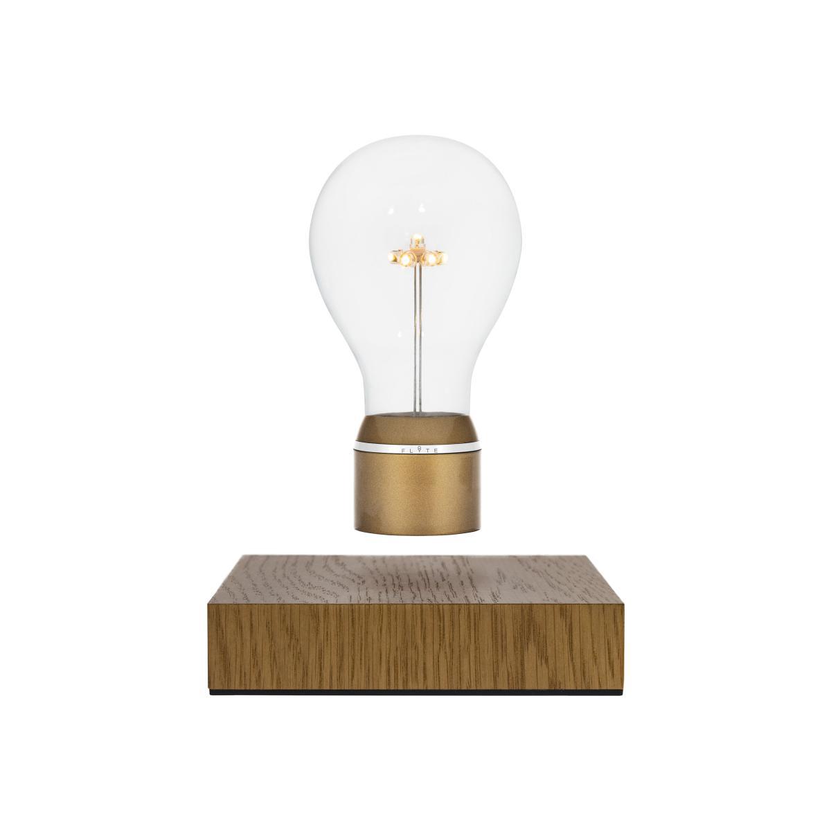 Flyte: a levitating lamp! This astonishing and spectacular Flyte lamp will leave you speechless. The bulb floats in the air as if by magic above its wooden base, defying the laws of gravity. A levitating bulb that rotates continuously on the spot. Flyte is an object of curiosity, a scientific experiment and a work of art all at the same time, a source of light and an extraordinary experience. Your guests will not believe their eyes! It is able to levitate thanks to an innovative magnetic technology integrated into its base. The bulb is powered wirelessly, by induction. To turn the light on or off, simply touch the wooden base. Even when turned off, the bulb continues to levitate and rotate. With its beautiful filament LED bulb (supplied) and streamlined natural-wood base, Flyte combines both a stunning vintage design and cutting-edge technology. The wooden base will also serve as a wireless charging station for your smartphone. Simply place your mobile phone on the base to recharge it wirelessly (works only with telephones equipped with the Qi wireless technology). The Flyte lamp was designed by Simon Morris, a Swede passionate about the levitation phenomenon. He also wanted his futuristic light fixture to be eco-friendly, so Flyte is manufactured in Sweden using certified sustainable wood. It is equipped with a low-consumption filament LED bulb with an estimated life of 22 years (when used 6 hours a day). This Flyte lamp was named one of “The 25 Best Inventions of 2016” by Time Magazine. The Flyte lamp box includes: -1 wooden magnetic base -1 Edison filament LED bulb -1 power cable with AC adapter -1 removable cork square designed to help centre the bulb on its base.