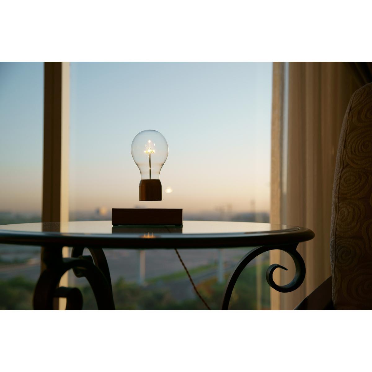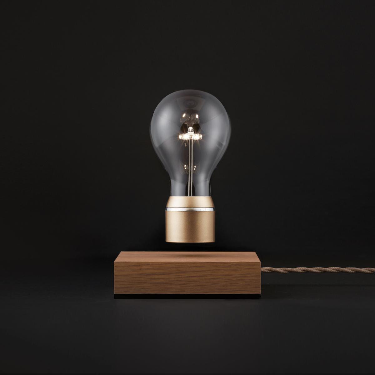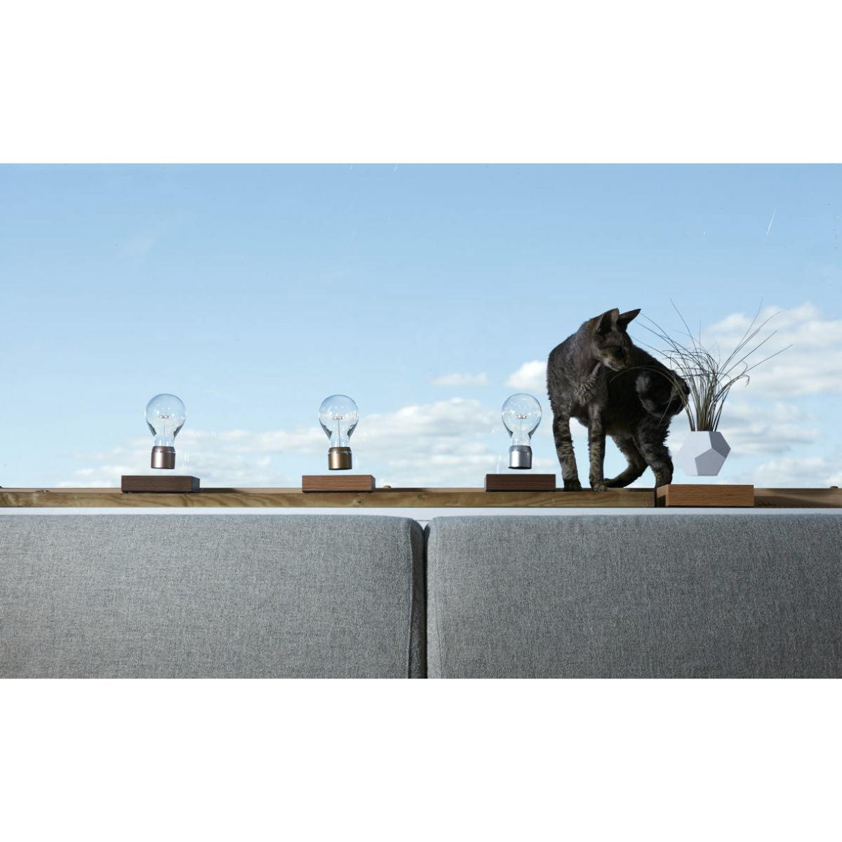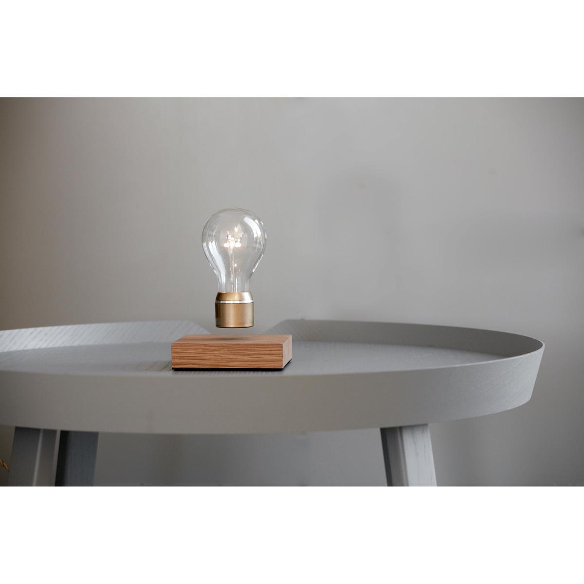 Flyte: a levitating lamp! This astonishing and spectacular Flyte lamp will leave you speechless. The bulb floats in the air as if by magic above its wooden base, defying the laws of gravity. A levitating bulb that rotates continuously on the spot. Flyte is an object of curiosity, a scientific experiment and a work of art all at the same time, a source of light and an extraordinary experience. Your guests will not believe their eyes! It is able to levitate thanks to an innovative magnetic technology integrated into its base. The bulb is powered wirelessly, by induction. To turn the light on or off, simply touch the wooden base. Even when turned off, the bulb continues to levitate and rotate. With its beautiful filament LED bulb (supplied) and streamlined natural-wood base, Flyte combines both a stunning vintage design and cutting-edge technology. The wooden base will also serve as a wireless charging station for your smartphone. Simply place your mobile phone on the base to recharge it wirelessly (works only with telephones equipped with the Qi wireless technology). The Flyte lamp was designed by Simon Morris, a Swede passionate about the levitation phenomenon. He also wanted his futuristic light fixture to be eco-friendly, so Flyte is manufactured in Sweden using certified sustainable wood. It is equipped with a low-consumption filament LED bulb with an estimated life of 22 years (when used 6 hours a day). This Flyte lamp was named one of “The 25 Best Inventions of 2016” by Time Magazine. The Flyte lamp box includes: -1 wooden magnetic base -1 Edison filament LED bulb -1 power cable with AC adapter -1 removable cork square designed to help centre the bulb on its base.