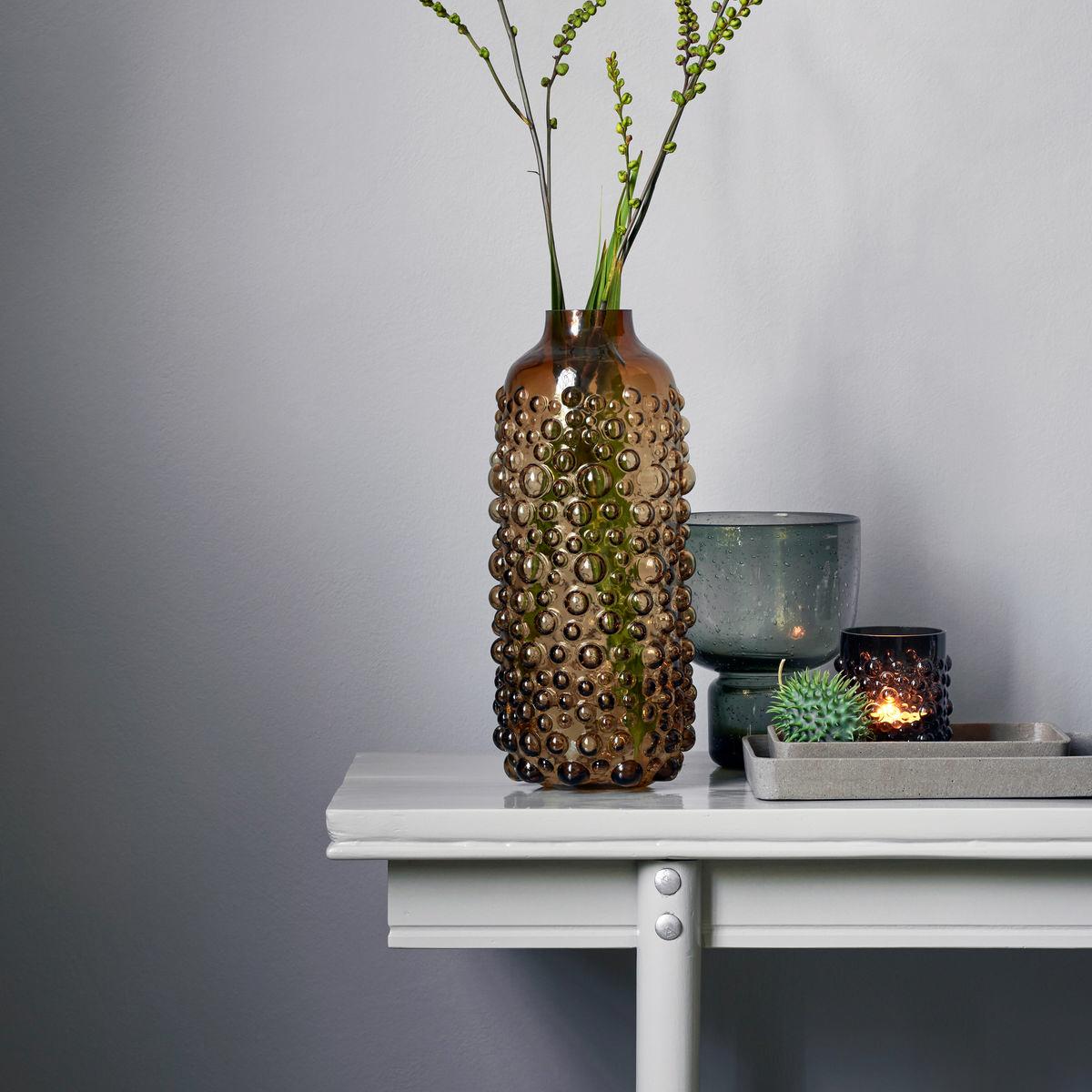 The Foam vase 40 cm by Danish brand House Doctor is a glass vase with a bubble-shaped surface, which creates a distinctive form. The height of the vase and its narrow opening make it perfect for flowers with long stems.
