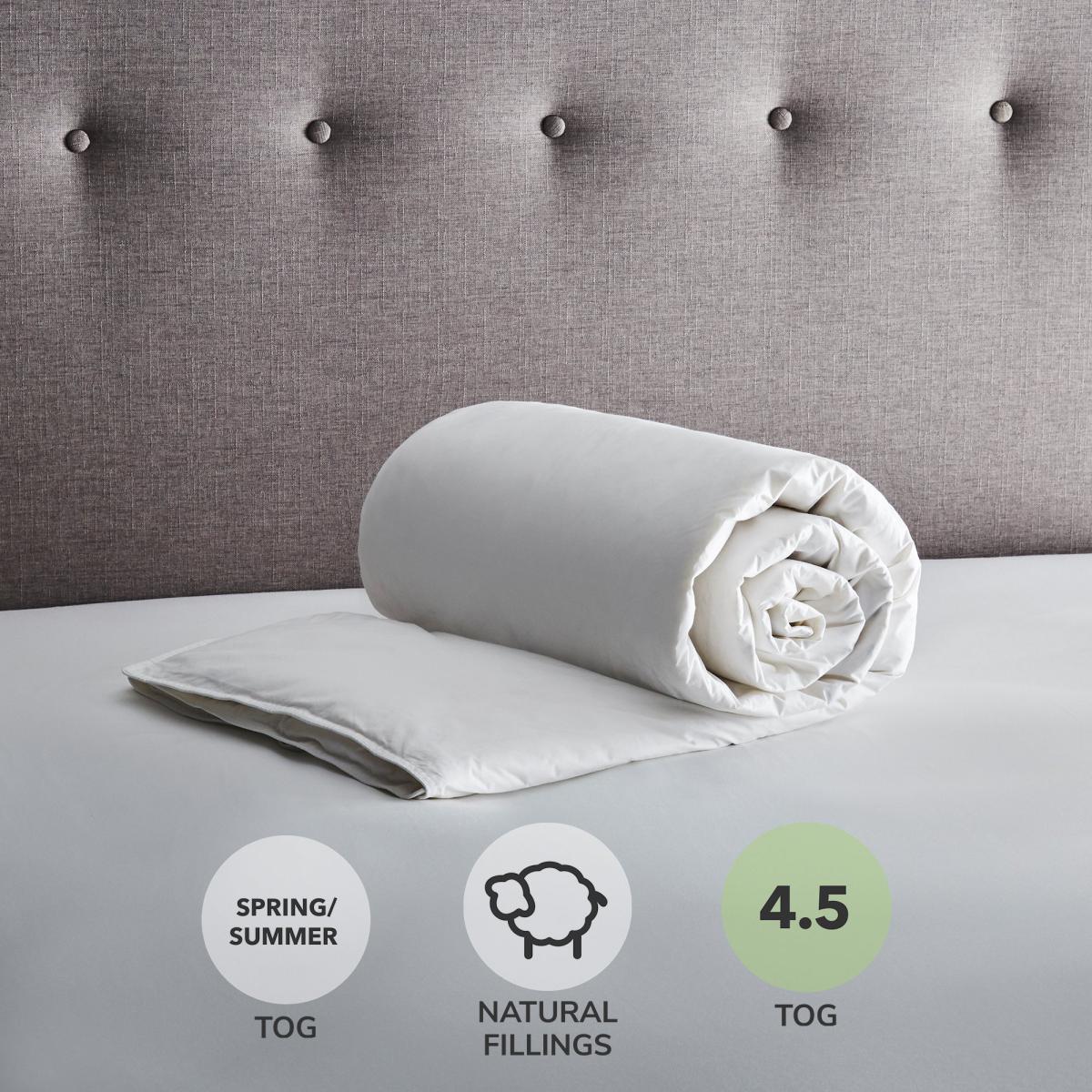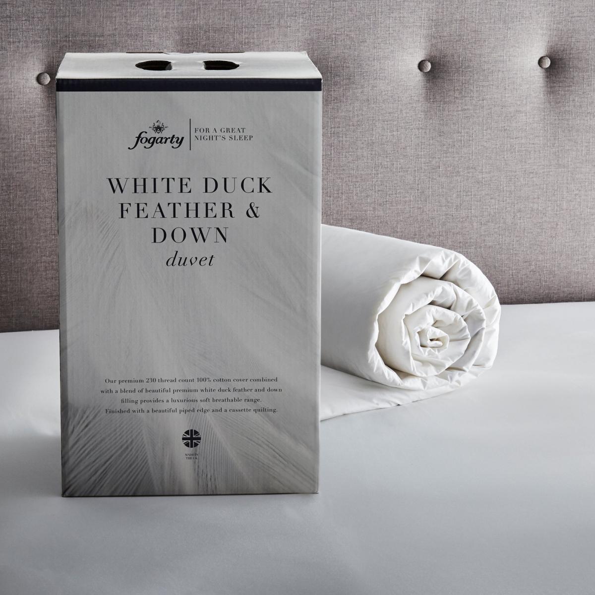 Filled with sumptuous duck feather and down for a cosy night’s sleep, this 4. 5 tog duvet has been designedto keep you cool during the warmer spring and summer months. With a pure, crisp cotton cover for added comfort, this duvet from the experts at Fogarty is available in a choice of sizes and machine washable for your convenience.